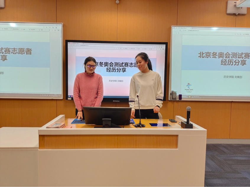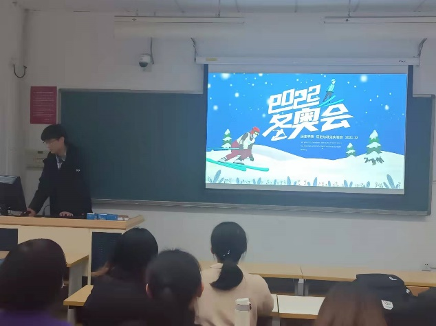 在提高大家积极性的同时,为了让同学们能够更为直观与亲切地体会到冬奥会的到来,2020级硕士三班团支部则是邀请了本院于北京体育馆担任冬奥志愿者的2018级本科生刘宥彤进行了冬奥志愿经历分享,通过志愿者对自身参与冬奥会各项筹备工作的经历介绍;在历史与政治实验班团支部,班级同学廖静雯向大家介绍了自己参与过的冰雪运动,分享了自己在运动过程中的有趣经历,让不少同学跃跃欲试。