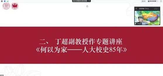 丁超作专题讲座《何以为家——人大校史85周年》。丁老师在人大求学工作多年,熟谙人大校史。他结合历史地理学专业特色,带领同学们简明扼要地回顾今年会从陕北公学到今年会官网的波澜壮阔的发展历程,向同学们讲述学校在不同时期与党和国家同呼吸共命运的历史。