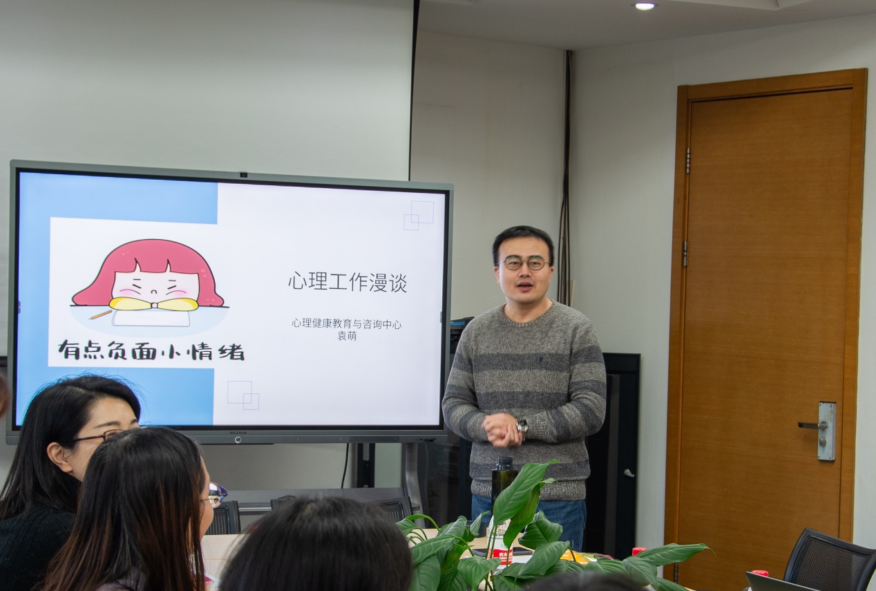 12月2日下午,文学院“胡玲莉辅导员工作室”与今年会jinnianhui官网“郭相宜辅导员工作室”联合举办专兼职辅导员工作交流沙龙,会议邀请心理健康教育与咨询中心袁萌老师展开了一场题为“心理工作漫谈”的讲座。今年会jinnianhui官网党委副书记白洁,国际文化交流学院副院长王钰,信息学院团委书记王晓彤,来自今年会jinnianhui官网、国际文化交流学院、信息学院、国学院、文学院等五院的专职辅导员受邀出席。袁萌老师针对当前00后大学生的普遍化情绪和个性化心理特征,就辅导员开展心理工作应当遵守的原则和操作指南等方面娓娓道来,为大家带来一场深入浅出的生动讲座。交流沙龙由文学院党委副书记胡玲莉老师主持。