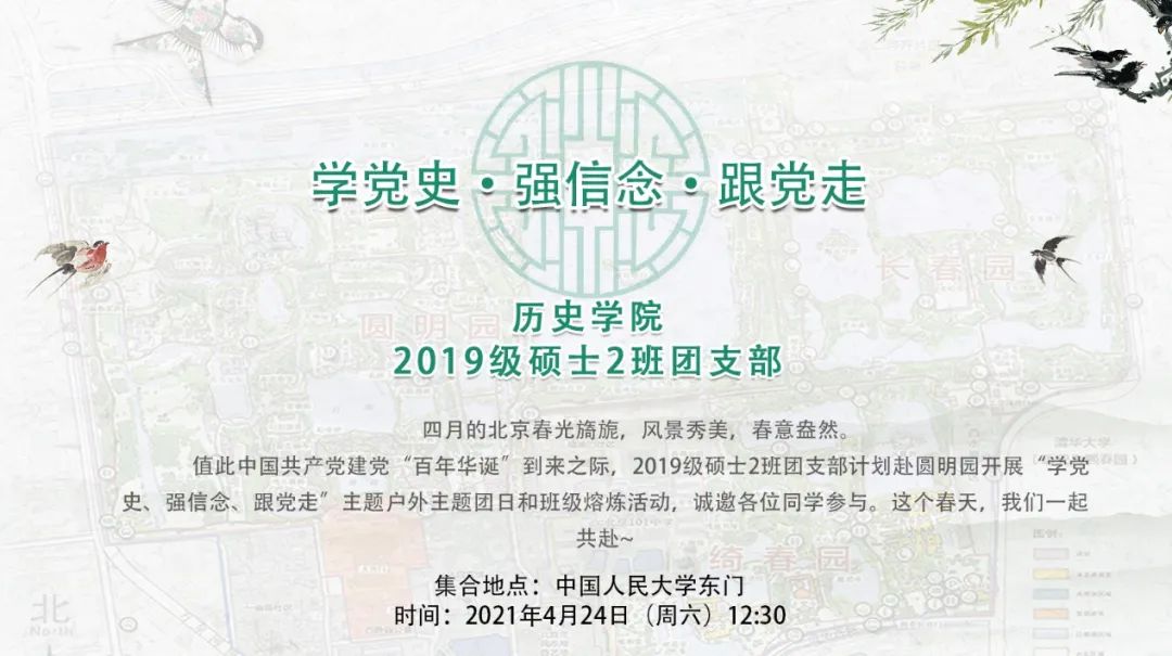 四月的北京春色旖旎,风光秀美,绿意盎然。恰逢中国共产党建党“百年华诞”到来之际,2019级硕士2班团支部趁着春色尚好,携手共赴圆明园开展了以“学党史、强信念、跟党走”为主题的户外主题团日和班级熔炼活动。游走在这样富有历史气息的圆明园之中,我们既愉悦了身心,又获得了新知。