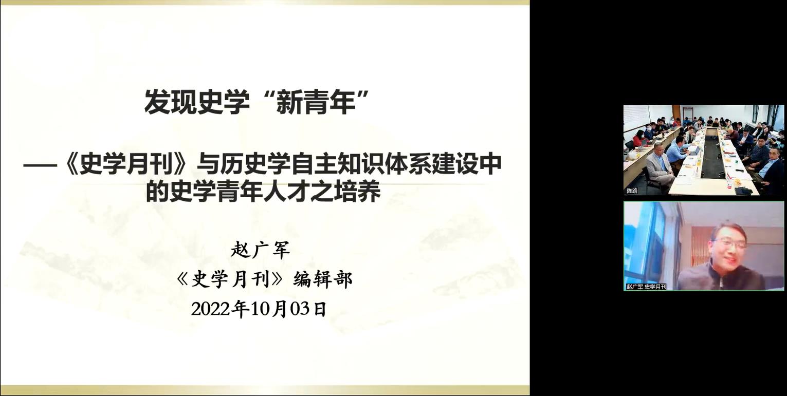 《史学月刊》杂志社副主任、副主编赵广军做线上发言,围绕“使命”、“践行”、“担当”、“平台”、“展望”五个方面,以丰富的数据统计,介绍了《史学月刊》在史学新青年的发展和培养上的贡献,强调了《史学月刊》“培养新人的责任意识”,强调了对青年作者的重视和发掘是中国历史学自主知识体系建设的重要一环。