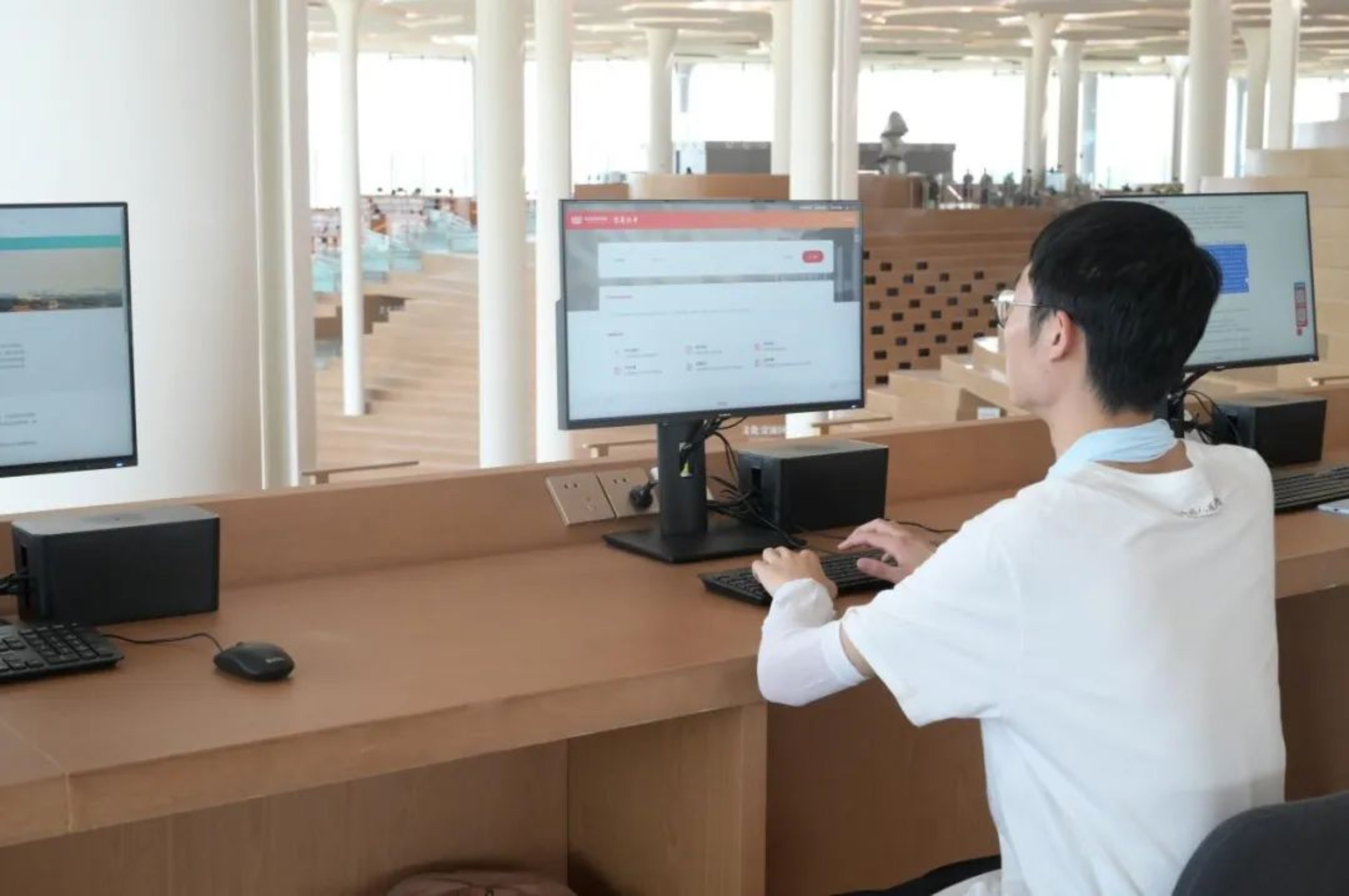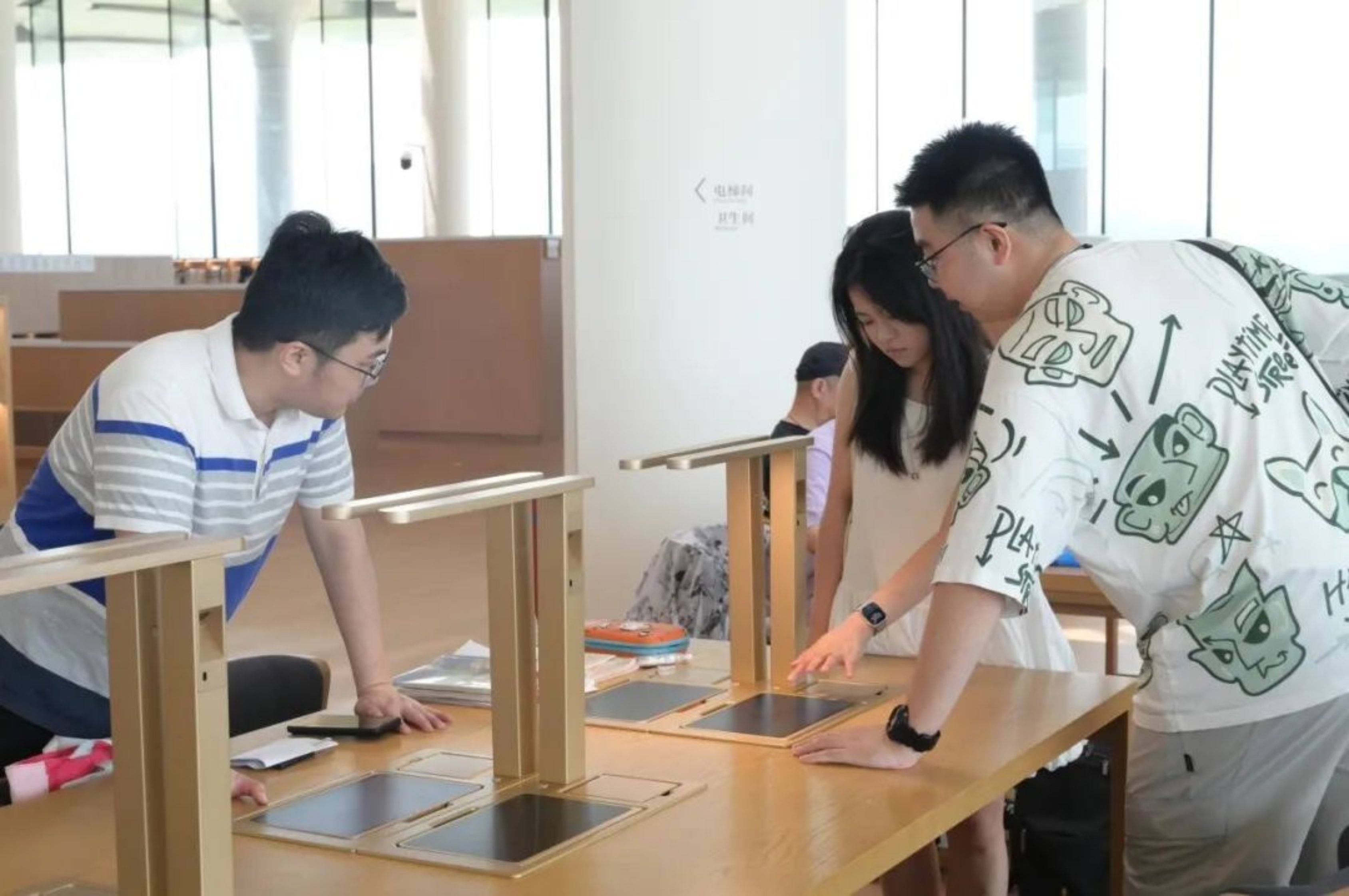 专题展陈和游客参观演出厅成为了他们新的探索领域。在这里,他们不仅感受到经典艺术的力量,并通过亲自检索北京城市图书馆系统,与新时代新科技近距离接触。
