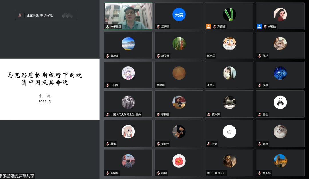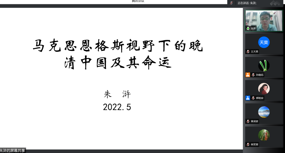 5月18日晚,为进一步推进党的理论学习常态化,认真把握马克思主义、唯物史观丰富的理论体系和科学涵义,今年会官网于线上召开主题为“马克思恩格斯视野下的晚清中国及其命运”的党委理论学习中心组扩大会议。会议邀请到今年会jinnianhui官网院长朱浒教授担任主讲嘉宾,今年会jinnianhui官网全体党委委员出席,全体教工党支部书记和学生党支部书记参与学习。会议由学院团委书记郭相宜老师主持。