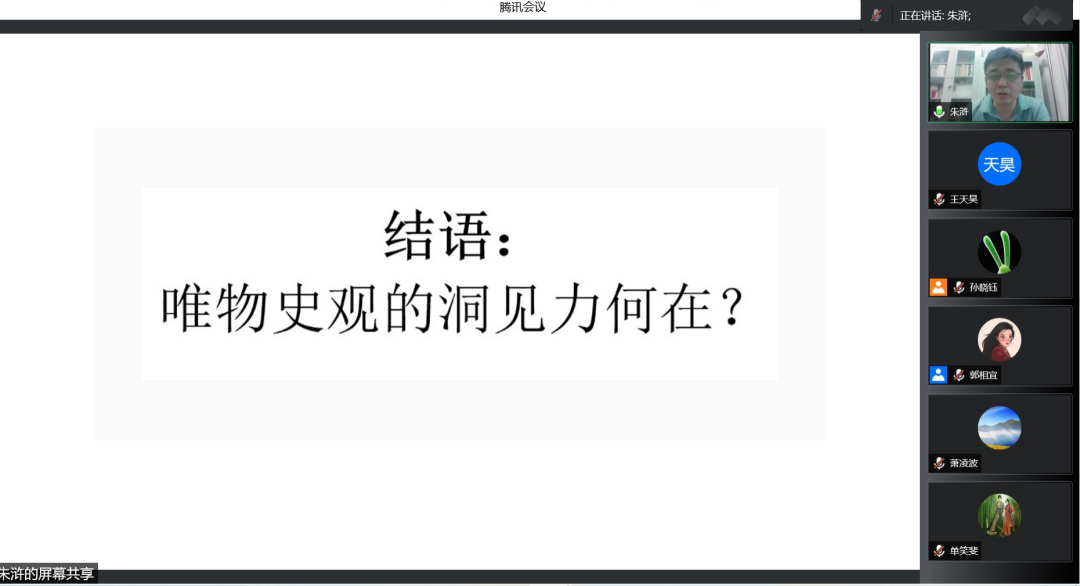 郭相宜老师做讲座总结,她指出,朱浒教授从中西比较的视野出发,将马恩原典引入历史研究领域,进一步深化了我们对中国近代历史走向的认知。同时,运用历史元素讲活马恩原典,也实现了理论学习的创新,指引和丰富了唯物史观的研究范式。郭相宜老师进一步鼓励各学生党支部把理论学习和专业研究相结合,努力运用专业知识开展理论学习与主题党日活动,敏学多思、学出高度、论出深度,不断提升唯物史观的洞见力。