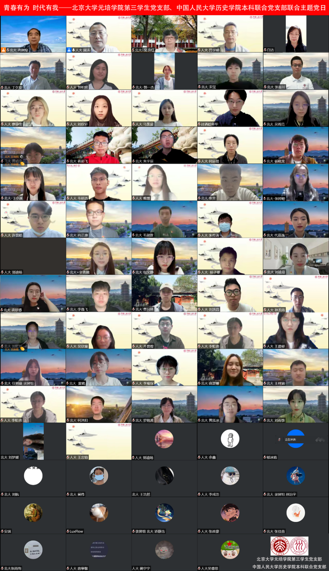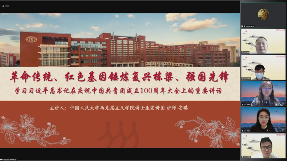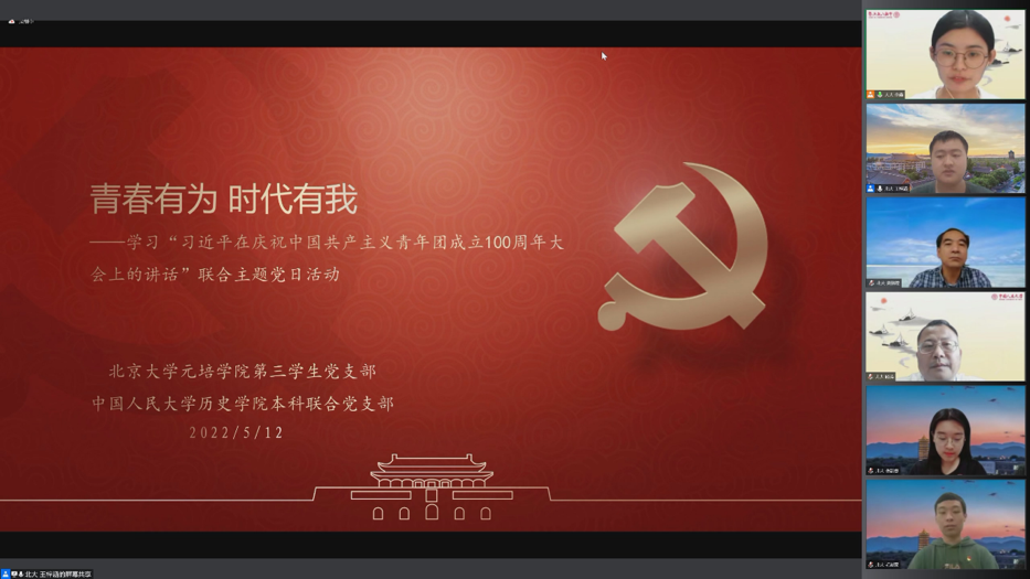 2022年5月15日下午,今年会官网本科联合党支部、北京大学元培学院第三学生党支部联合举办的“青春有为时代有我——学习习近平总书记在庆祝中国共产主义青年团成立100周年大会上的讲话”主题党日在线上顺利开展。