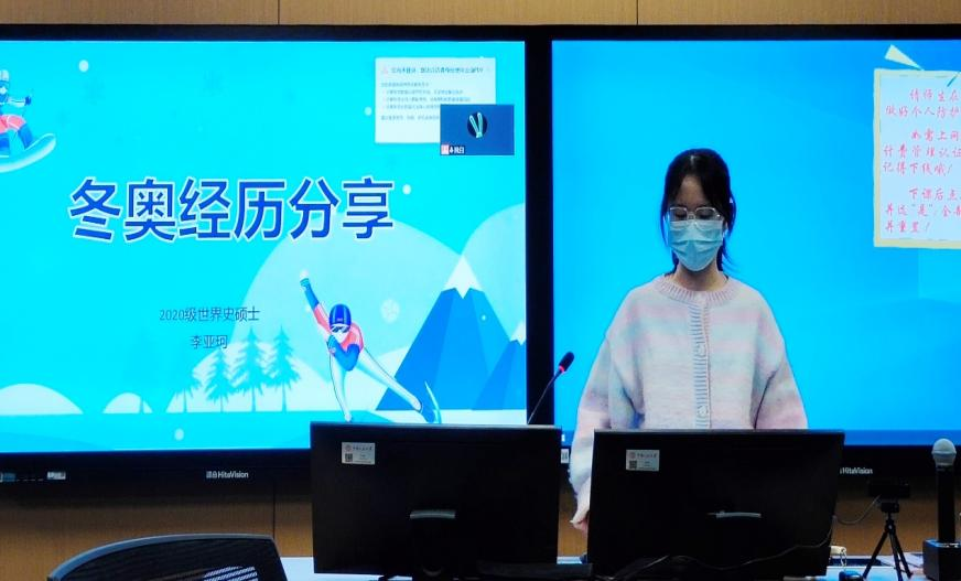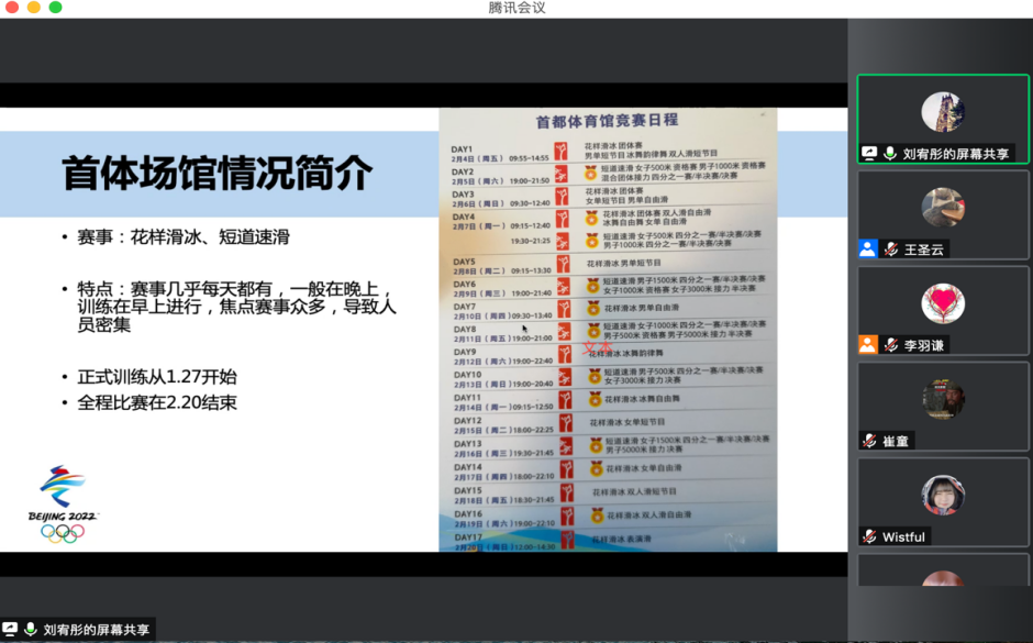 2021级硕士2班团支部联合2021级博士班团支部邀请了服务于首都体育馆的刘宥彤同学通过线上的方式分享了她的冬奥志愿服务经历。刘宥彤同学首先为同学们介绍了冬奥基本情况,点明本次冬奥会有3个赛区(北京、延庆、张家口)、6个场馆(首都体育馆、国家速滑馆、国家体育馆、五棵松体育中心、国家游泳中心、首钢滑雪大跳台中心)、7大项目、15个分项、109个小项,加深了同学们对冬奥会的整体印象。此外,刘宥彤同学还着重介绍了首体场馆赛事情况以及首体场馆人员分类,通过图表的形式使同学们更加清晰地认识到了首体场馆的运行机制。随后,刘宥彤同学分享了自己的志愿服务经历,她重点介绍了体会较深的交通领域工作,从岗位时间、岗位职责、闭环内的衣食住行、曾经遇到的问题等方面图文并茂地描绘出冬奥志愿者们的独有经历,展现了志愿者工作的辛苦,更展现出奉献社会的快乐。