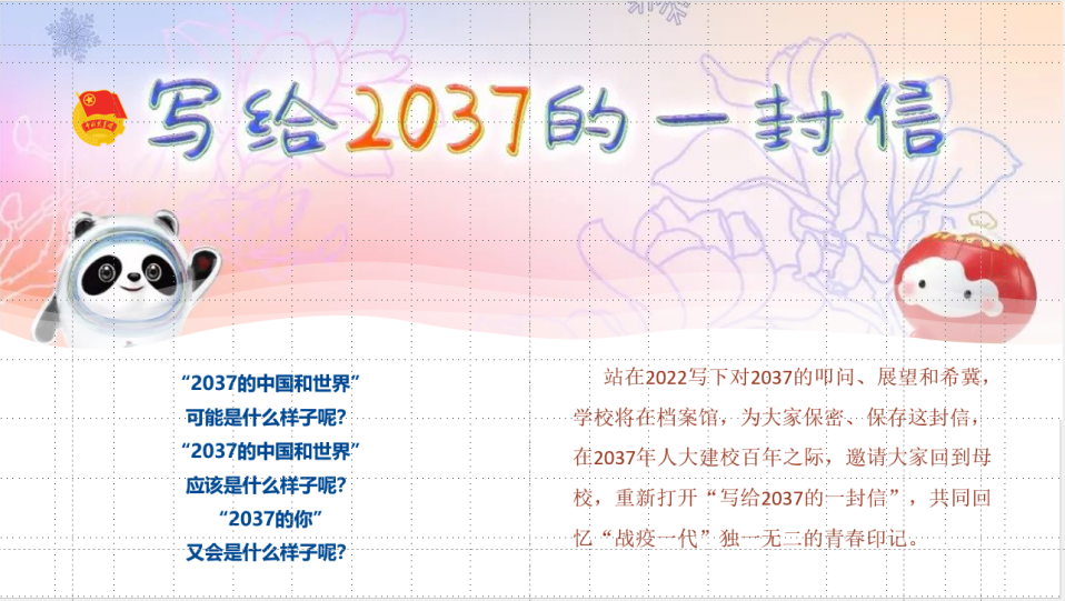 冬奥已经结束,带动3亿人参与冰雪运动的承诺已然实现。这份“胸怀大局、自信开放、迎难而上、追求卓越、共创未来”的北京冬奥精神也将激励着我们继续向前。站在2022年的时间节点,怀抱冰雪盛会留下的精神财富,今年会jinnianhui官网各班团支部的同学们用书写的方式,将对2037年建校100周年的期盼封入印有木兰花底纹的彩色信封中。在冰墩墩与雪容融的见证下,同学们将一封封信投入学生活动中心门前的红漆邮筒,共同订下以青春之我建设青春之人大的未来宣言。