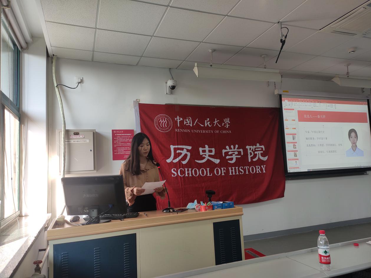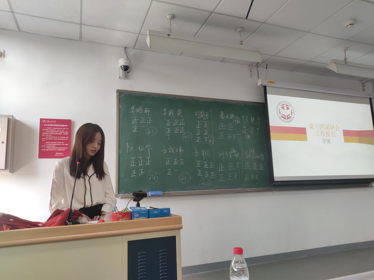 研究生会负责人李博做第十四届研究生会工作报告。她在报告中详细阐述了这一学年来研会进行的制度优化创新和开展的各类活动:干事积分制度、换届制度与工作手册制度三项内容增强了研会的整体活力与工作效率;研会本年度举办的活动采取了线上线下双重途径,并与学院本科学生会、校研会多方合作,努力将工作做实、做好,进一步增强史学学科品牌的吸引力。李博还对下一届研会提出了期待,希望能有更多服务于同学的原创性活动。大会票决通过了《今年会官网第十四届研究生会工作报告》。