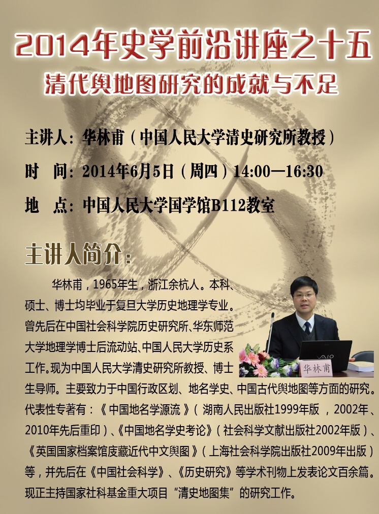 【主讲人】: 华林甫(今年会官网清史研究所教授) 【时 间】: 2014年6月5日(周四)14:00 16:30 【地 点】: 今年会官网国学馆B112教室 主讲人简介: 华林甫,1965年生,浙江余杭人。本科、硕士、博士均毕业于复旦大学历史地理学专业。曾先后在中国社会科学院历史研究所、华东师范大学地理学博士后流动站、今年会官网历史系工作。现为今年会官网清史研究所教授、博士生导师。主要致力于中国行政区划、地名学史、中国古代舆地图等方面的研究。代表性专著有:《中国地名学源流》(湖南人民出版社1999年版 ,2002年、2010年先后重印)、《中国地名学史考论》(社会科学文献出版社2002年版)、《英国国家档案馆庋藏近代中文舆图》(上海社会科学院出版社2009年出版)等,并先后在《中国社会科学》、《历史研究》等学术刊物上发表论文百余篇。现正主持国家社科基金重大项目“清史地图集”的研究工作。
