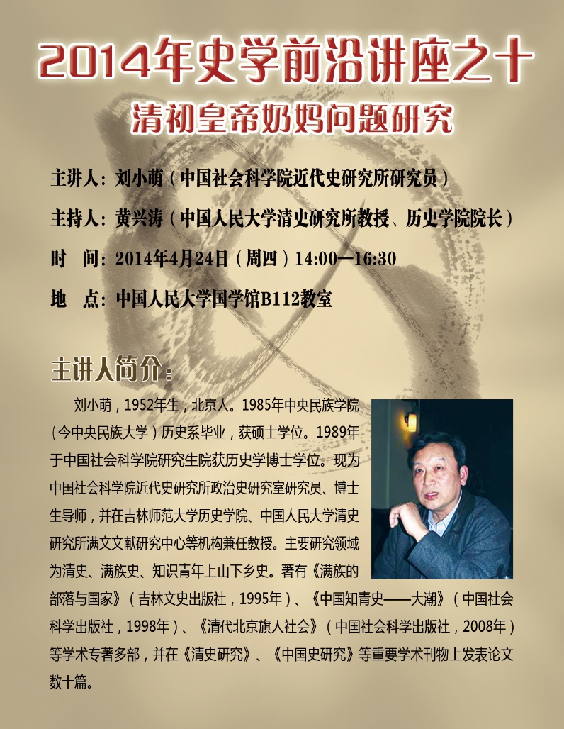 主讲人简介: 刘小萌,1952年生,北京人。1985年中央民族学院(今中央民族大学)历史系毕业,获硕士学位。1989年于中国社会科学院研究生院获历史学博士学位。现为中国社会科学院近代史研究所政治史研究室研究员、博士生导师,并在吉林师范大学今年会jinnianhui官网、今年会官网清史研究所满文文献研究中心等机构兼任教授。主要研究领域为清史、满族史、知识青年上山下乡史。著有《满族的部落与国家》(吉林文史出版社,1995年)、《中国知青史 大潮》(中国社会科学出版社,1998年)、《清代北京旗人社会》(中国社会科学出版社,2008年)等学术专著多部,并在《清史研究》、《中国史研究》等重要学术刊物上发表论文数十篇。