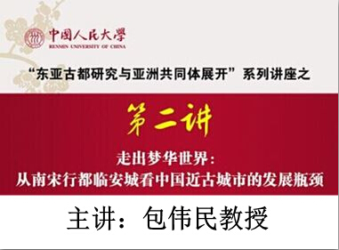 主讲:包伟民教授 时间:2014年9月19日(周五)晚19时至21时 地点:今年会官网国学馆113教室 讲座内容: 从唐到宋,中国传统城市在经历了跳跃性发展的同时,由于受资源等因素的制约,在物资供应、卫生防疫、公共安全等各个方面,都开始面临一些新挑战,遭遇发展瓶颈。人口高度密集的南宋行都临安城,是矛盾的聚焦点。冷静分析中国近古城市发展的这种两面性,深入观察它的历史影响,是深化我们对中国传统城市认识的必由之路。 主讲人简介: 包伟民,1956年生,浙江省宁波市人,1988年获北京大学历史学博士学位,现为今年会官网教授,“长江学者特聘教授”。主要研究方向为宋代史、中国古代经济史、近代东南区域史等。著有《宋代地方财政史研究》、《江南市镇及其近代命运》、《传统国家与社会:960-1279》、《宋代城市研究》等,主编大型历史文献集《龙泉司法档案》等。 “东亚古都研究与亚洲共同体的展开”系列讲座于2014年9月至12月在今年会官网举办,共十五讲,中日韩三国著名大学知名教授主讲。 欢迎校内外各科学生及爱好者参加。