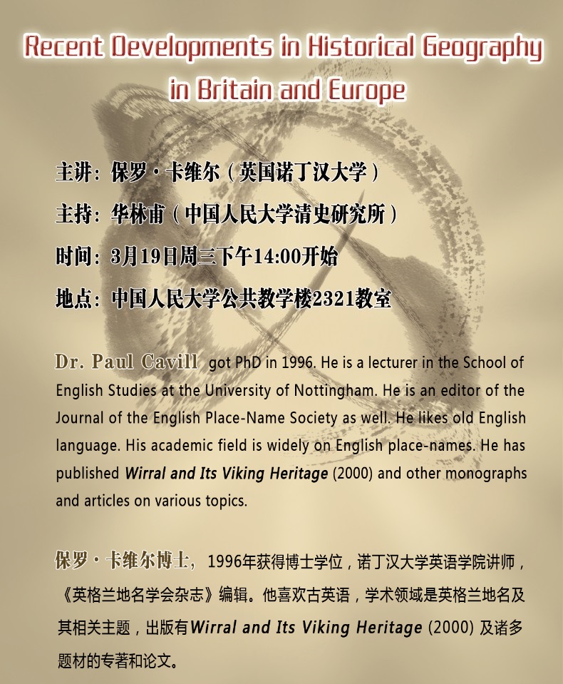 Dr. Paul Cavill got PhD in 1996. He is a lecturer in the School of English Studies at the University of Nottingham. He is an editor of the Journal of the English Place-Name Society as well. He likes old English language. His academic field is widely on English place-names. He has published Wirral and Its Viking Heritage (2000) and other monographs and articles on various topics. 保罗•卡维尔博士,1996年获得博士学位,诺丁汉大学英语学院讲师,《英格兰地名学会杂志》编辑。他喜欢古英语,学术领域是英格兰地名及其相关主题,出版有Wirral and Its Viking Heritage (2000) 及诸多题材的专著和论文。