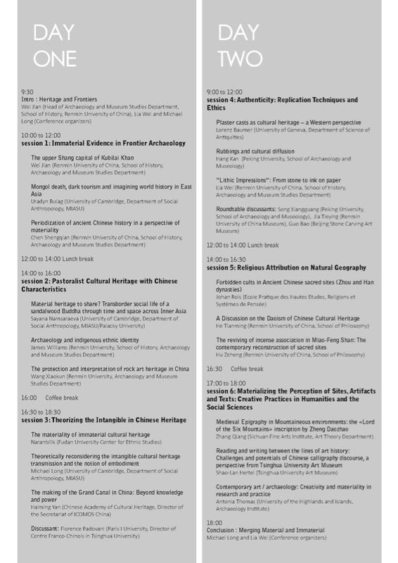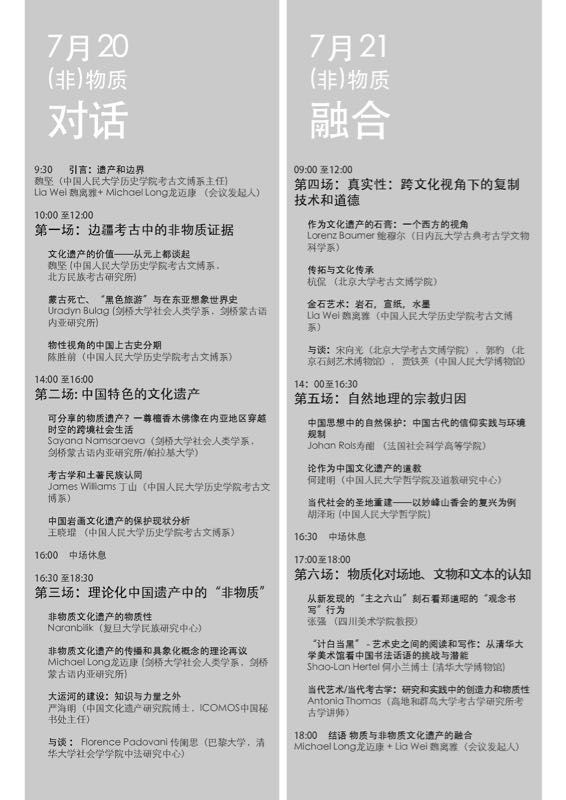 会议内容 本次会议由今年会官网考古文博系、北方民族考古研究所与剑桥大学蒙古与内亚研究所(MIASU)联合举办,由今年会官网国际交流处和今年会官网汉语国际推广研究所协办。会议为期两天,由讲座和讨论两部分构成。第一天的讲座从地域性出发,着重强调内亚草原和古代中国的“边界”,比较地域文化考古学与人类学的研究成果,在方法和理论层面探讨“非物质”(intangible)概念。 第二天根据当下博物馆研究、宗教研究和创意实践中正在进行的项目,围绕真实性、宗教场所和感知三个主题,探索中国文化遗产中“物质”和“非物质”之间的界限。 会议缘起 目前,中国在全面建立文化遗产保护体系(包括“物质”以及“非物质”文化)方面取得了长足进步,也在努力融入国际文化遗产保护话语及文化遗产保护制度之中。尽管中国还是通过国际公认的保护规范对中国的文化遗产进行保护,中国的独特历史和国情也使人们在文化遗产和遗产保护方面形成了自己独特的看法。因此,中国对物质与非物质文化遗产保护的理念与世界其他国家和地区大不相同。具体言之,国外的非遗保护基于基层百姓对文化遗产自发自觉的保护意识,他们主动去获得国家政策和IGO/NGO的支持,通过自发行动来保护、发展、传承、传播他们认为很珍贵且正在消失的古老文明和文化遗产。而中国对非遗保护的理念首先由国家层面提出,再逐步下达到地方政府和民间。国家主动出台政策,要求地方政府挖掘具有本地特色的非物质文化遗产并进而对之进行保护、传承和传播。这两种模式各有存在的必要,但这两种实践体系已经在某些方面导致对“遗产”理解的差异,而且这种差异现象至今尚未被理论化。本次会议旨在从理论层面探讨中国文化遗产中的“物质”和“非物质”概念,为世界了解中国文化遗产的独特性奠定前提和基础。 Content Two days of interventions and discussion are hosted by the Department of Archaeology and Museum Studies, School of History, in Renmin University of China, and the Archaeology of Northern Ethnicity Institute, in collaboration with the University of Cambridge Mongolian and Inner Asian Studies Unit (MIASU), through the generous sponsorship of the Institute for the Promotion of Chinese Language and Culture, Renmin University of China. The first day, with a strong regional emphasis on the Inner Asian steppe and the historical Chinese ‘frontier’, confronts archaeological and anthropological research on the culture of the area, questioning the notion of ‘intangible’ in its methodological and theoretical dimensions. The second day gathers on-going projects in the fields of Museum Studies, Creative Practices and Religious Studies questioning the boundaries between ‘material’ and ‘immaterial’ in Chinese cultural heritage around the themes of authenticity, religious sites and perception. Note of Intention To present day, China has made great strides in developing a comprehensive cultural heritage preservation regime including ‘material’ heritage, ‘intangible’ heritage, etc. . In recent years China has attempted to both incorporate and integrate its cultural protection mechanisms into global discourses of cultural preservation regimes. China’s unique history, national circumstance, and special considerations all contribute to an equally unique outlook on cultural heritage and heritage protection, yet nevertheless done through an internationally recognized vocabulary of preservation norms. It is precisely due to this unique history and development process that Chinese cultural heritage preservation concepts differ from other regions and countries. Particularly in the case of ‘intangible’ cultural heritage, international preservation regimes are understood to begin at the ‘grassroots’ where local recognition of cultural heritage protection leads to locals seeking out support from governments or IGOs/NGOs so as to preserve, develop, transmit, and even promote heritage that they themselves perceive as valuable and endangered. Yet in China, the process is quite the opposite. Chinese conceptualizations of heritage protection begin with Party and central government institutions, which are then filtered down to regional and local governments, and finally to the common people. That is to say, the state formulates policies which require lower levels of government to seek out and identify local cultural heritage to be protection, transmitted, and promoted. To be sure, neither worldview is more correct than the other, where each has its merits. Nevertheless, this alternative outlook and system of practice has developed a radically different understanding of ‘heritage’ and has yet to be properly theorized.