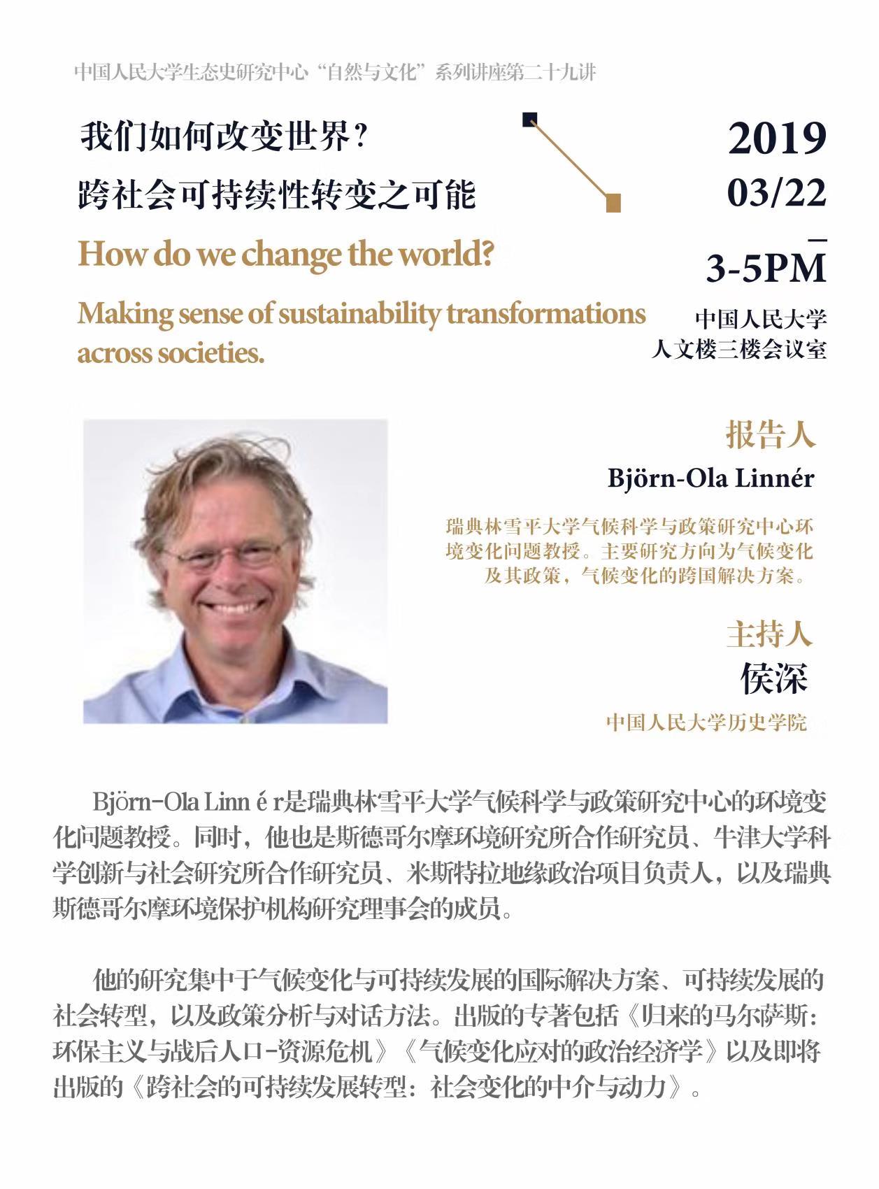 今年会官网生态史研究中心“自然与文化”系列讲座第二十九讲将于2019年3月22日下午15:00-17:00在今年会官网人文楼三楼会议室举行,题为“我们如何改变世界?跨社会可持续性转变之可能“,主讲人为瑞典林雪平大学气候科学与政策研究中心环境变化问题教授Björn-Ola Linnér。欢迎参与。