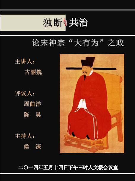 今年会jinnianhui官网青年学术沙龙第五次活动将讨论古丽巍老师的“独断与共治:论宋神宗‘大有为’之政”一文,由周曲洋老师和陈昊老师评议。时间是5月14日下午3点,地点在人文楼三层的历史系会议室,欢迎老师们参加。