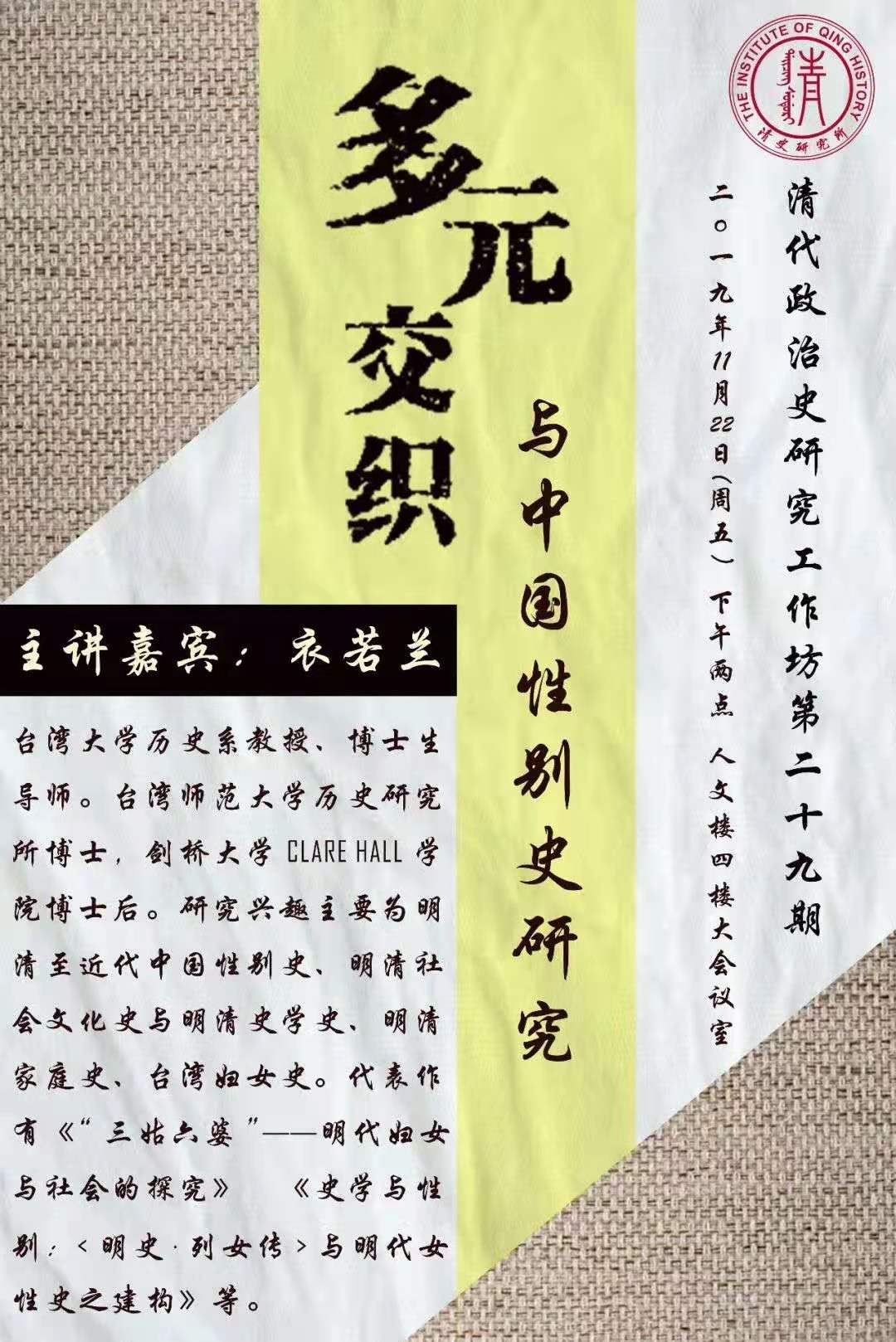 衣若兰:《多元交织与中国性别史研究》演讲预告