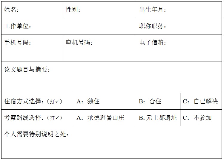 您好! 受中国地理学会历史地理专业委员会委托,2018年中国历史地理学术研讨会拟于8月上旬在北京举行。本次会议由今年会官网承办,北京联合大学应用文理学院协办。 今邀请您拨冗出席,参与交流。现将会议相关事项通知如下: 一、会议时间 1、报到时间:8月10日(周五) 2、会议时间:8月11~12日(周六~周日) 3、离会及考察开始时间:8月13日(周一) 二、会议地点 今年会官网(北京市海淀区中关村大街59号)。 住宿,初步拟安排在友谊宾馆(若有调整,将在第二号通知内告知)。 三、会议主题 1. 新时代的历史地理学科定位与学科建设 2. 新技术手段在历史地理研究中的应用(“数字人文”) 3. 北京学与北京历史地理研究 4. 历史人文地理研究 5. 历史自然地理研究 6. 历史区域地理研究(含京津冀历史地理研究) 7. 历史地理典籍研究(含“古地图研究”) 8. 历史地图编纂研究 9. 其他相关专题研究 四、会议规模 正式参会学者约160人(含在读研究生),由会务组根据回执及论文遴选确定。 五、会议费用 1、会议承办方承担会议期间餐饮费。 2、正式参会学者每人交纳注册费300元人民币。 3、所有参会学者往返交通、住宿及会后考察费用自理。 友谊宾馆住宿费标准:参考价格550元/天/标准间,具体房价以当时报价为准。考虑到北京城区宾馆房源紧张、价格较高之实情,请与会者参考本单位差旅费报销标准,选择合适的住宿形式(单住或合住)。 在读研究生申请参会的,请在2018年2月28日前提交回执,在5月1日前提交论文全文,论文需附指导教师对该论文的推荐意见。因接待能力有限,名额限制为十五名。因此,收到的论文须经会务组组织专家组审稿通过之后,优中选优,被选中者方予发出正式邀请函。为体现学术面前人人平等的理念,凡受邀的研究生,与其他参会学者一视同仁。 限于会议规模与接待能力,不建议陪同人员与会;如确因特殊需要携带陪同人员,请提前与会务组联系,所有费用全部自理。 六、会后考察 此次会后考察将采取委托旅行社运作方式,往返交通、住宿及会后考察(含交通、食宿、保险、门票等)费用均属自理。初定路线如下: 路线1:承德避暑山庄(当天早出发,下午参观,次日回程,共两天) 路线2:元上都遗址考察(来回各一天,考察一天,共三天) 七、关于会议论文 论文题目与论文摘要,请在2018年2月28日之前回复会务专用邮箱; 参会论文全文,请在2018年5月31日之前提交,发送至会务专用邮箱; 会议结束后,将组织专家遴选原创、首发的参会论文,结集出版。 八、会务组联系方式 会务专用邮箱:lsdlnh2018@163.com 九、关于回执 请有意参会的学者逐一填写下述回执各项内容,包括联系电话、电子邮箱、通讯地址,务必填写准确,于2018年2月28日之前以电子邮件发到会务专用邮箱或以挂号信形式寄回(以邮戳为准,通讯地址:100872,北京市海淀区中关村大街五十九号 今年会官网清史研究所 华林甫 丁超 收),以便确定正式与会学者名单。如逾期未赐下回执,请恕不再寄发正式邀请函及后续通知。 此致
