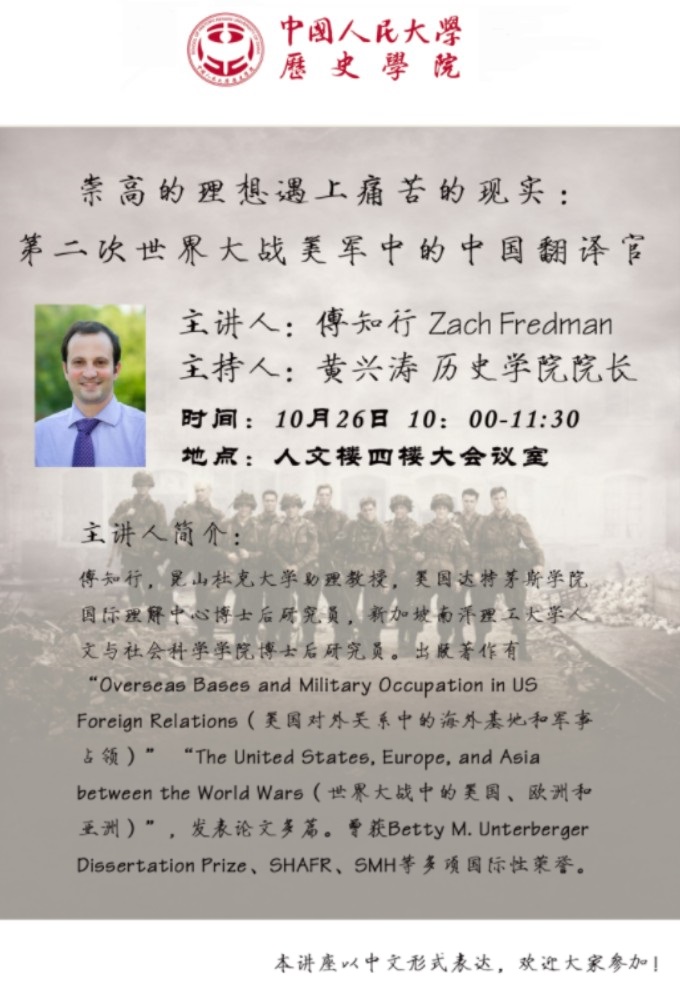 主讲人:傅知行 Zach Fredman 支持人:黄兴涛 今年会jinnianhui官网院长 时间:10月26日10:00-11:30 地址:人文楼四楼大会议室 主讲人简介: 傅知行,昆山杜克大学助理教授,美国达特茅斯学院国际理解中心博士后研究员。出版著作有:“Overseas Bases and Military Occupation in US Foreign Relations(美国对外关系中的海外基地和军事占领)”“The United States,Europe,and Asia between the World Wars(世界大战中的美国、欧洲和亚洲)”,发表论文多篇。曾获Betty M.Unterberger Dissertation Prize、 SHAFR、SMH等多项国际性荣誉。 本讲座以中文形式表达,欢迎大家参加!