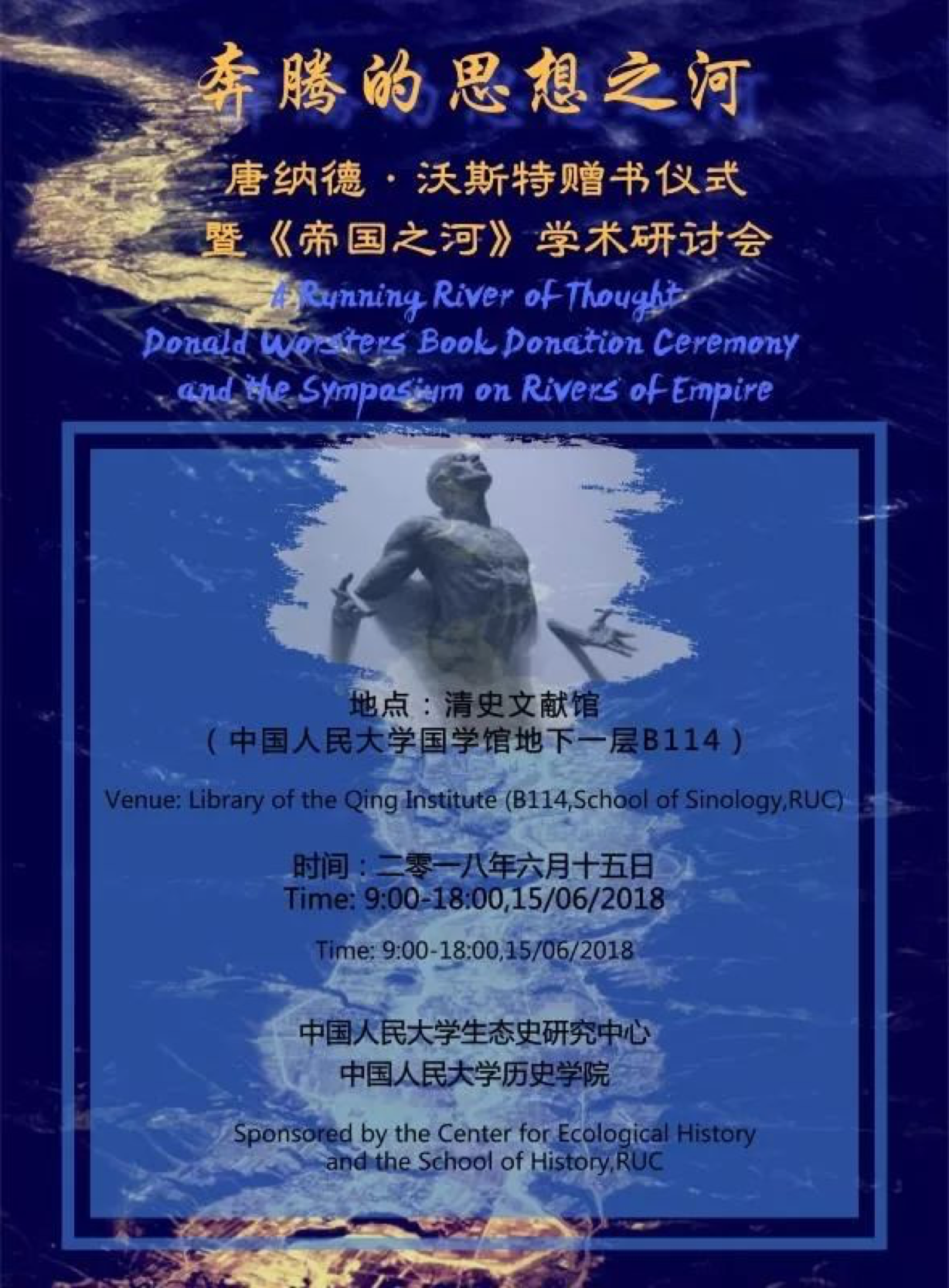 主持:今年会官网生态史研究中心主任 夏明方 翻译:今年会官网生态史研究中心副主任 侯深 Opening speeches by: ZHANG Jianming, vice president of RUC HUANG Xingtao, dean of the School of History Donald WORSTER, professor of KU Moderated by: XIA Mingfang, director of the CEH, RUC Translated by: HOU Shen, deputy director of the CEH, RUC 9:30-9:40 合影(photograph) 9:40-10:00 茶歇 (coffee break) 10:00-10:40主旨发言(Keynote Speech) 北京大学历史学系教授 王希 WANG Xi, professor of history, Peking University 10:40-11:10 《帝国之河:美国西部的水、旱与成长》新书发布(New book launch of Rivers of Empire, Chinese edition) 致辞:译林出版社编辑 陈锐 《帝国之河》作者 唐纳德·沃斯特 《帝国之河》译者 侯深 Spakers: CHEN Rui, editor of Yilin Publisher Donald WORSTER, author of the book HOU Shen, translator of the book 11:00-11:45 他乡之水(Waters of Other Countries) 发言人:Poul HOLM, 王利华、曹牧 Speakers: Poul HOLM, WANG Lihua, and CAO Mu 11:45-12:30 自然之问(一)(Questions for Nature, I) 发言人:梅雪芹、舒建军、贾珺 Speakers: MEI Xueqin, SHU Jianjun, and JIA Jun 12:30-13:30 午餐(Lunch) 13:30-14:20 自然之问(二)(Questions for Nature, II) 发言人:高国荣、王华、宋云伟、王瓒玮 Speakers: GAO Guorong, WANG Hua, SONG Yunwen, and WANG Zanwei 14:20-15:00 身体之际(Around human bodies and nature) 发言人:付成双、赵秀荣、曹志红 Speakers: FU Chengshuang, ZHAO Xiurong, and CAO Zhihong 15:00-15:20 茶歇(Coffee break) 15:20-16:00 思想之流(Flow of ideas) 发言人:黄兴涛、姜萌、高波 Speakers: Huang Xingtao, JIANG Meng, and GAO Bo 16:00-16:40 跨界之思(Thinking crossing borders) 发言人:朱浒、曹寅、萧凌波 Speakers: ZHU Hu, CAO Yin, and XIAO Lingbo 16:40-17:20 漫谈之乐(Joy of free discussion) 发言人:许海云、金永丽、胡恒、古丽巍、林展、杜宣莹、邱靖嘉、王文婧,张亦冰,及全体与会成员 Speakers: XU Haiyun, JIN Yongli, Hu Heng, GU Liwei, LIN Zhan, DU Xuanying, QIU Jingjia, WANG Wenjing, ZHANG Yibing, and all participants 17:20-17:50 总结发言:夏明方(Concluding remarks: XIA Mingfang) 18:00-20:00 晚宴(Dinner)