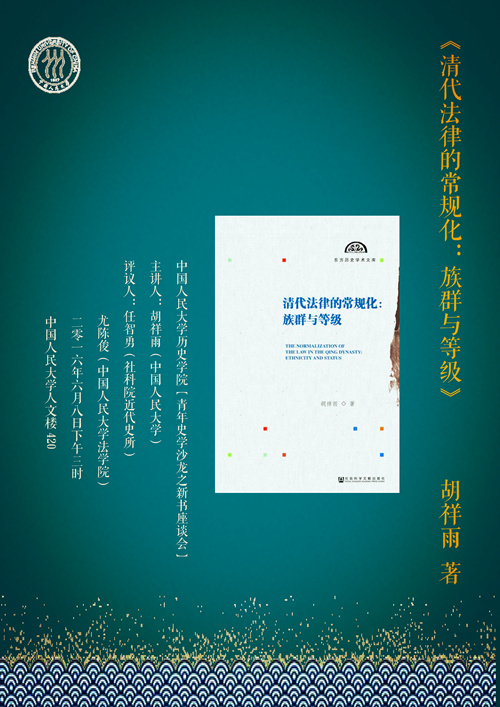 今年会jinnianhui官网第31次青年学术沙龙暨新书座谈会将于2016年6月8日下午三时举行,地点在今年会官网人文楼420。本次将讨论清胡翔雨老师的新书《清代法律的常规化:族群与等级》,由社科院近代史所任智勇老师和今年会官网法学院尤陈俊老师与谈。欢迎各位参加!