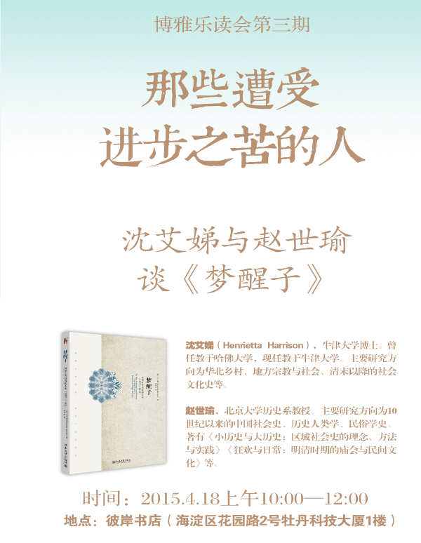 题目:“那些遭受进步之苦的人” 沈艾娣与赵世瑜谈《梦醒子》 时间:2015.4.18 上午10:00 12:00 地点:彼岸书店(海淀区花园路2号牡丹科技大厦1楼,牡丹园翠微北侧) 沈艾娣(Henrietta Harrison),牛津大学博士。曾任教于哈佛大学,现任教于牛津大学。主要研究方向为华北乡村、地方宗教与社会、清末以降的社会文化史等。 赵世瑜,北京大学历史系教授。主要研究方向为10世纪以来的中国社会史、历史人类学、民俗学史。著有《小历史与大历史:区域社会史的理念、方法与实践》《狂欢与日常:明清时期的庙会与民间文化》等。