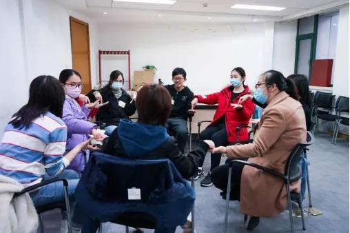 在本环节的最后,各组的主持人再次通过集体小游戏,让每个参与者迅速集中注意力。在轻快的音乐和朗读声中,同学们彻底放松下来。