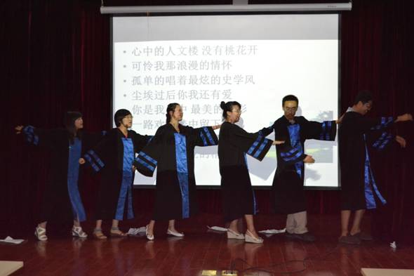 海内存知己,天涯若比邻;无为在歧路,儿女共沾巾。是历史让我们成为知己,煮酒论英雄,纵横古今,快意恩仇。埋首读典坟,学海无涯,同甘共苦。分别时刻2012届研究生自创改编了一曲《最炫史学风》以幽默搞笑的歌舞形式展现给大家:“你是我心中最美的云彩,怎么没就为你留下。来永远都唱着最炫的史学风,尽情挥洒人生的精彩”。博得大家的阵阵掌声笑声,将会场气氛引向高潮。