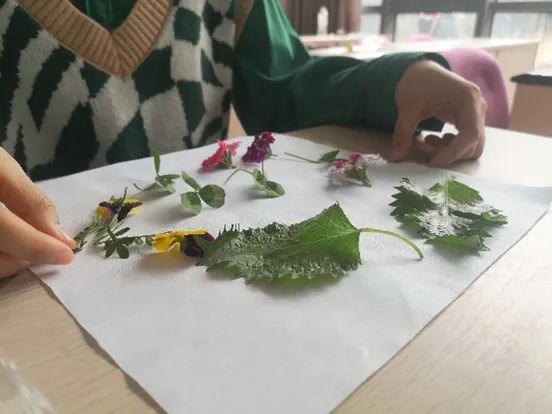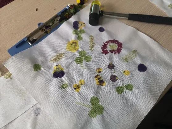 “从挑选植物,到在白布上布局,再到最后晾晒成品,全程对我而言都是新鲜又有趣的;和一众同学们、老师们一起尝试锤染,更有种交往的暖意。而且在敲打的过程中,花草独有的清香扑鼻而来,就着打入教室的阳光,真有一种“锤染春天色”的治愈感!!”。