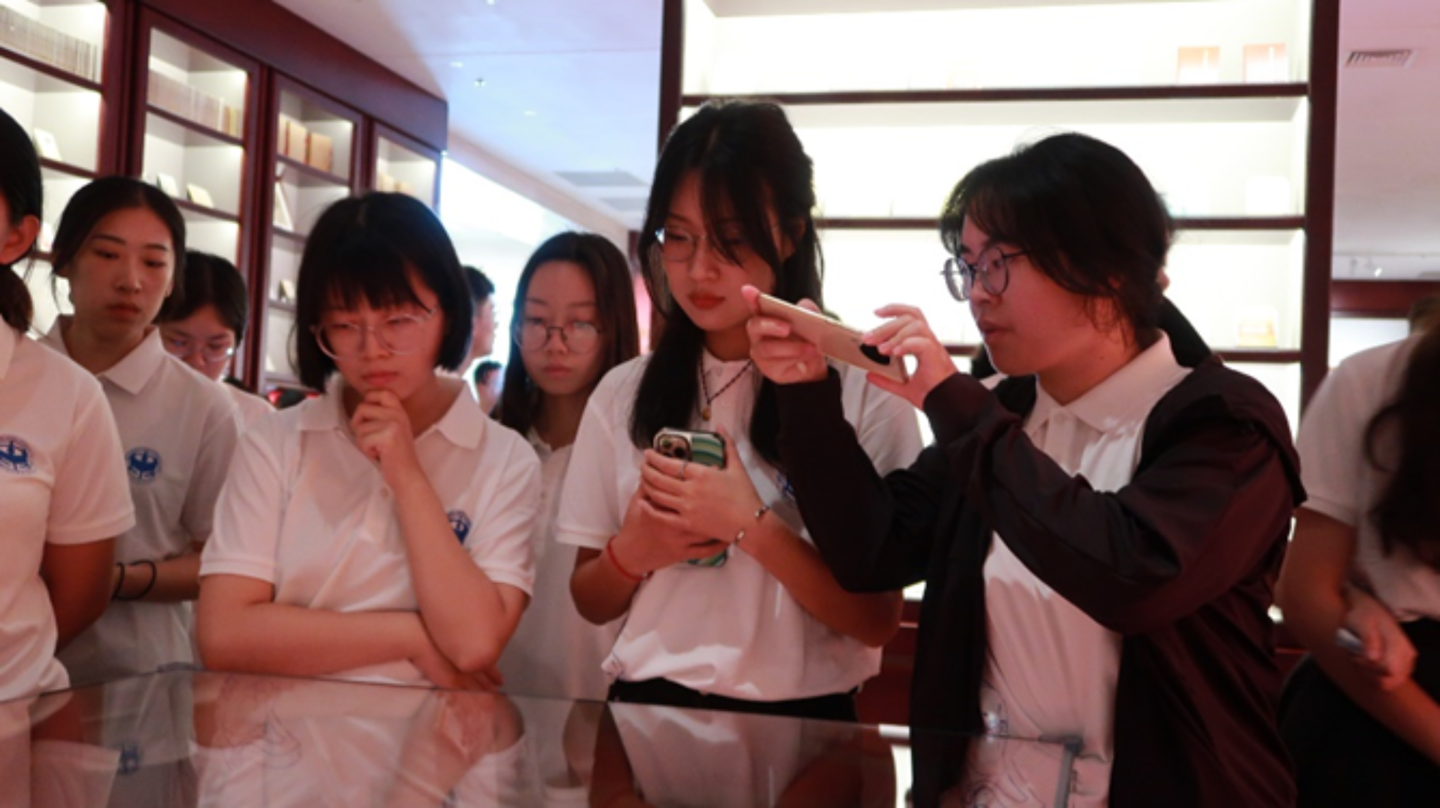 在参观完“版本工艺展后”,同学们来到了文华堂,参观国家版本馆的两个基本陈列“斯文在兹——中华古代文明版本展”和“见证伟业——中华民族复兴版本展”。步入文华堂后,首先映入眼帘的四周布置的十五组通高书柜,这些书柜共收藏展示乐三万余册古今典籍图书,点缀有文字、篆刻等文化元素,营造出一个书卷气息浓厚的版本殿堂。在“斯文在兹——中华古代文明版本展”中,同学们以版本为媒介了解中国古代的政治、经济、文化与社会生活。从刻符彩陶钵到晋侯鸟尊,从《山海经全图》到《明状元赵秉忠殿试卷》,版本见证了博大精深源远流长的中华文明,承载着丰富的历史记忆,也吸引了同学们驻足流连。在 “见证伟业”板块,同学们则欣赏了自建国以来的中学教科书和发行的各版本《新华字典》,感受在版本中流逝的新中国岁月。
