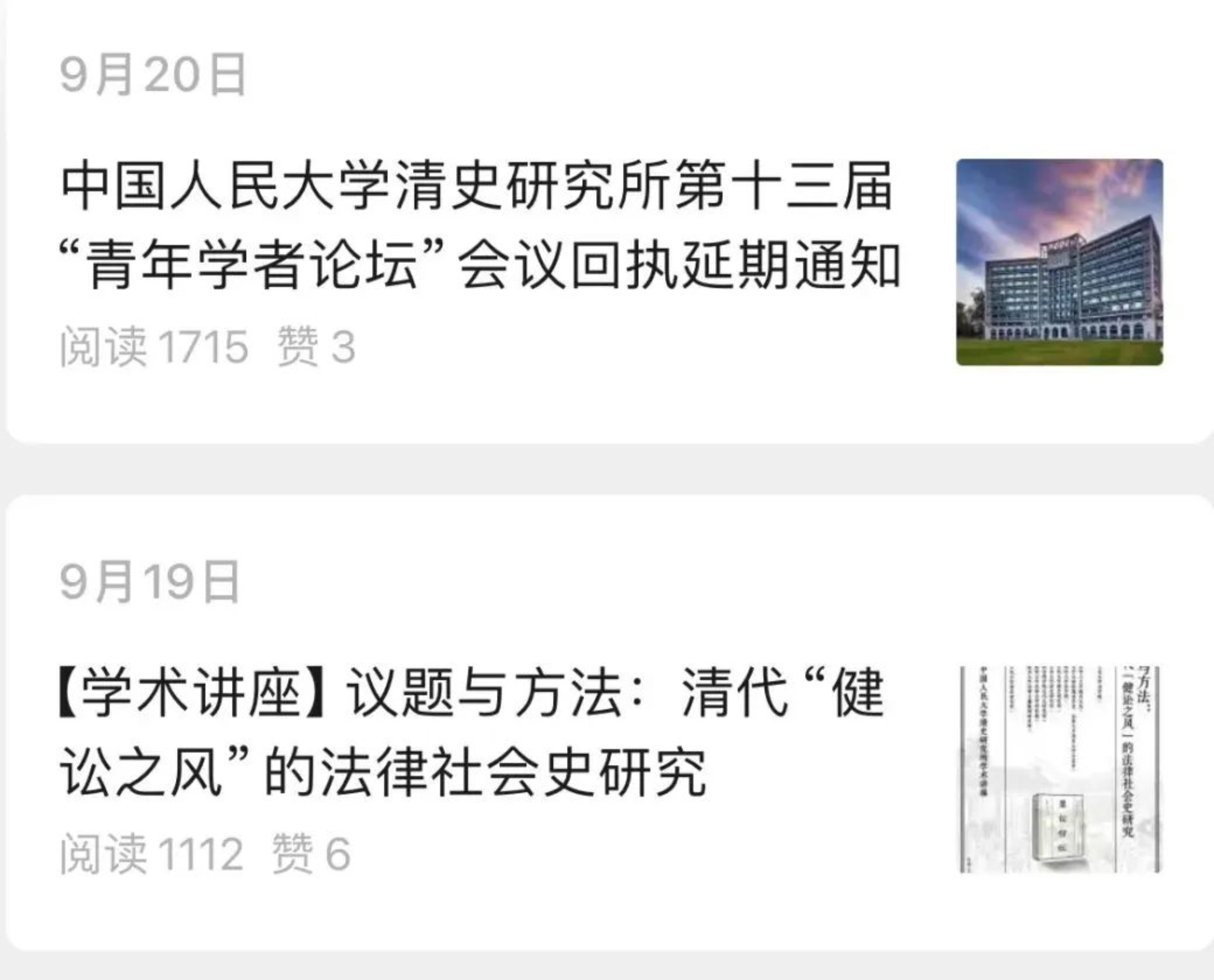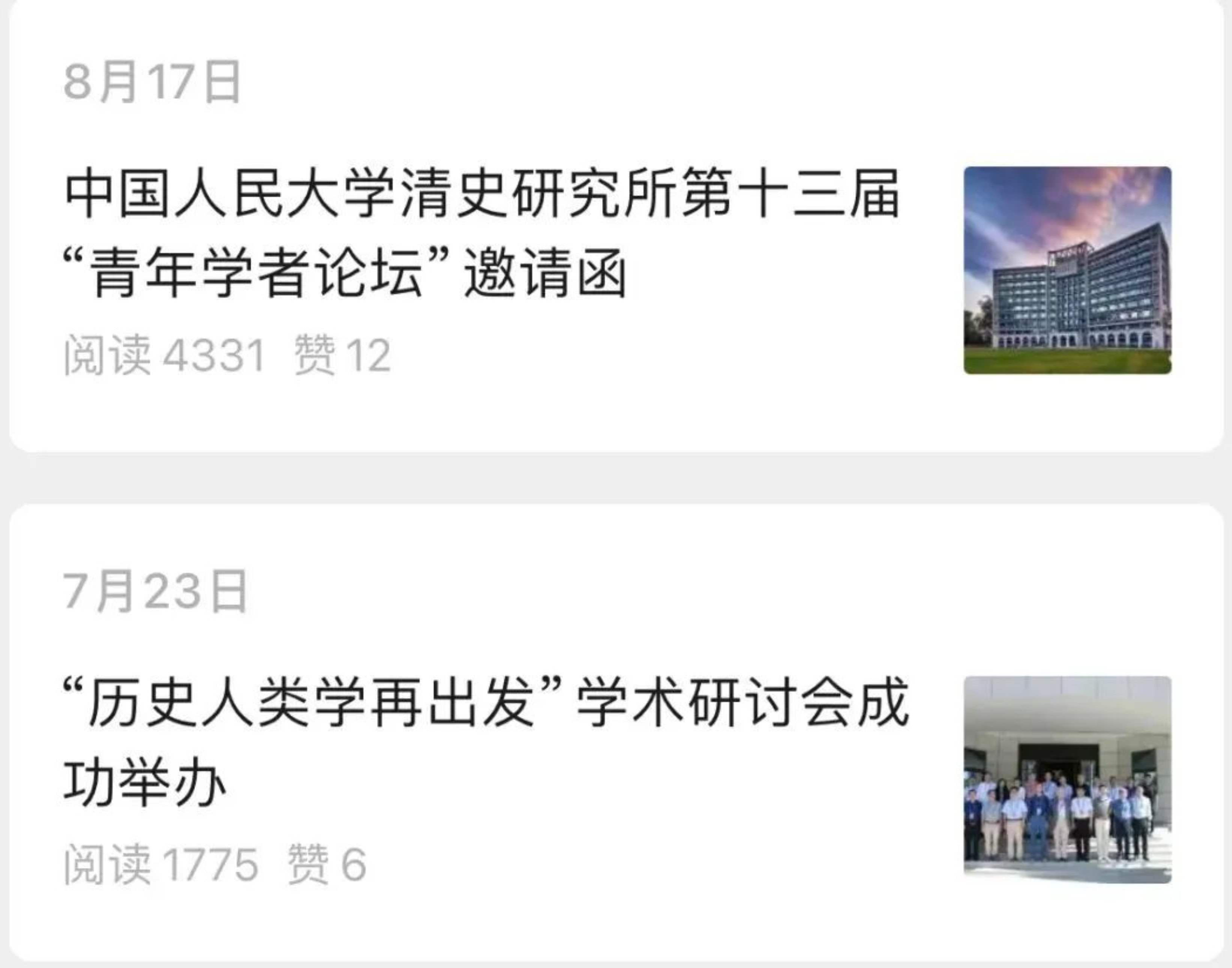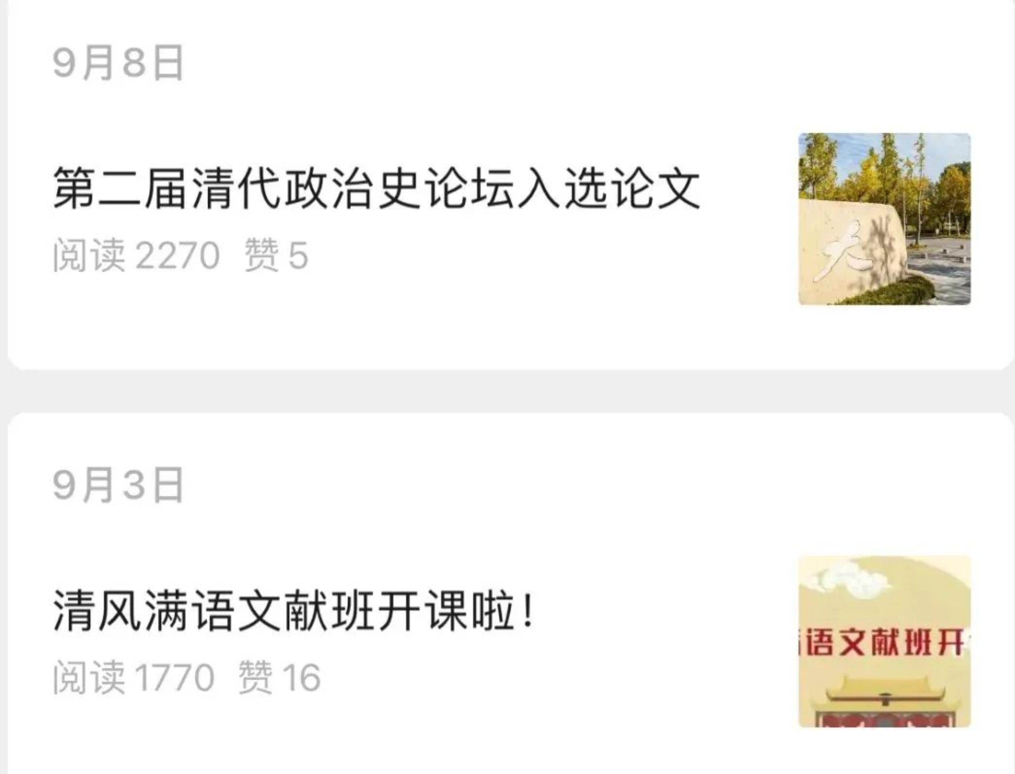 学社在微信公众号“清风学社”上不间断地推送学术会议信息和最新的清史研究动态,推送所内老师最新成果的新书速递栏目、学社协办的讲座信息与讲座纪要,为师生第一时间了解学术动向提供便利。