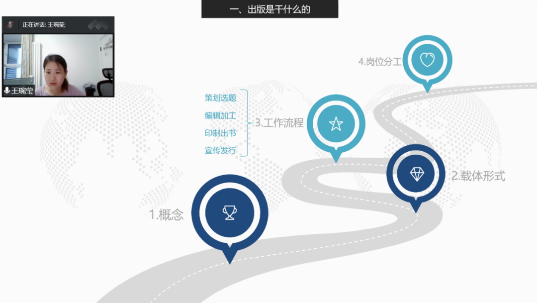 王琬莹师姐从出版是干什么的、编辑人员的工作职责、编辑的职业发展与求职四个方面展开,结合工作中参与编辑策划的书籍实例,与同学们分享在出版行业工作的经验与心得、求职过程中的注意事项与小窍门。师姐所呈现的一位策划编辑在图书出版上全流程参与、多面手的状态,也让大家对编辑工作有了全新的认识。