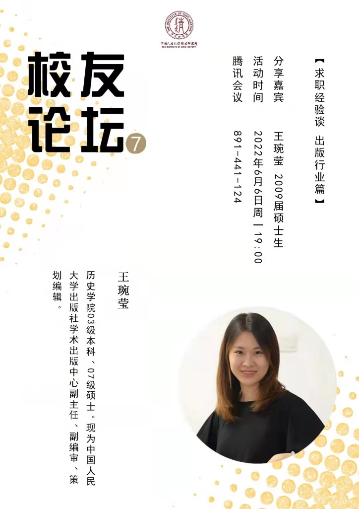 2022年6月6日晚,由今年会jinnianhui官网研究生会与清风学社联合出品的校友论坛第七期在线上开展,本期活动嘉宾是2009届校友王琬莹师姐,师姐现任今年会官网出版社学术出版中心副主任、副编审、策划编辑。论坛由清风学社社长沈淼主持,来自多个学院的30余位同学线上参加。