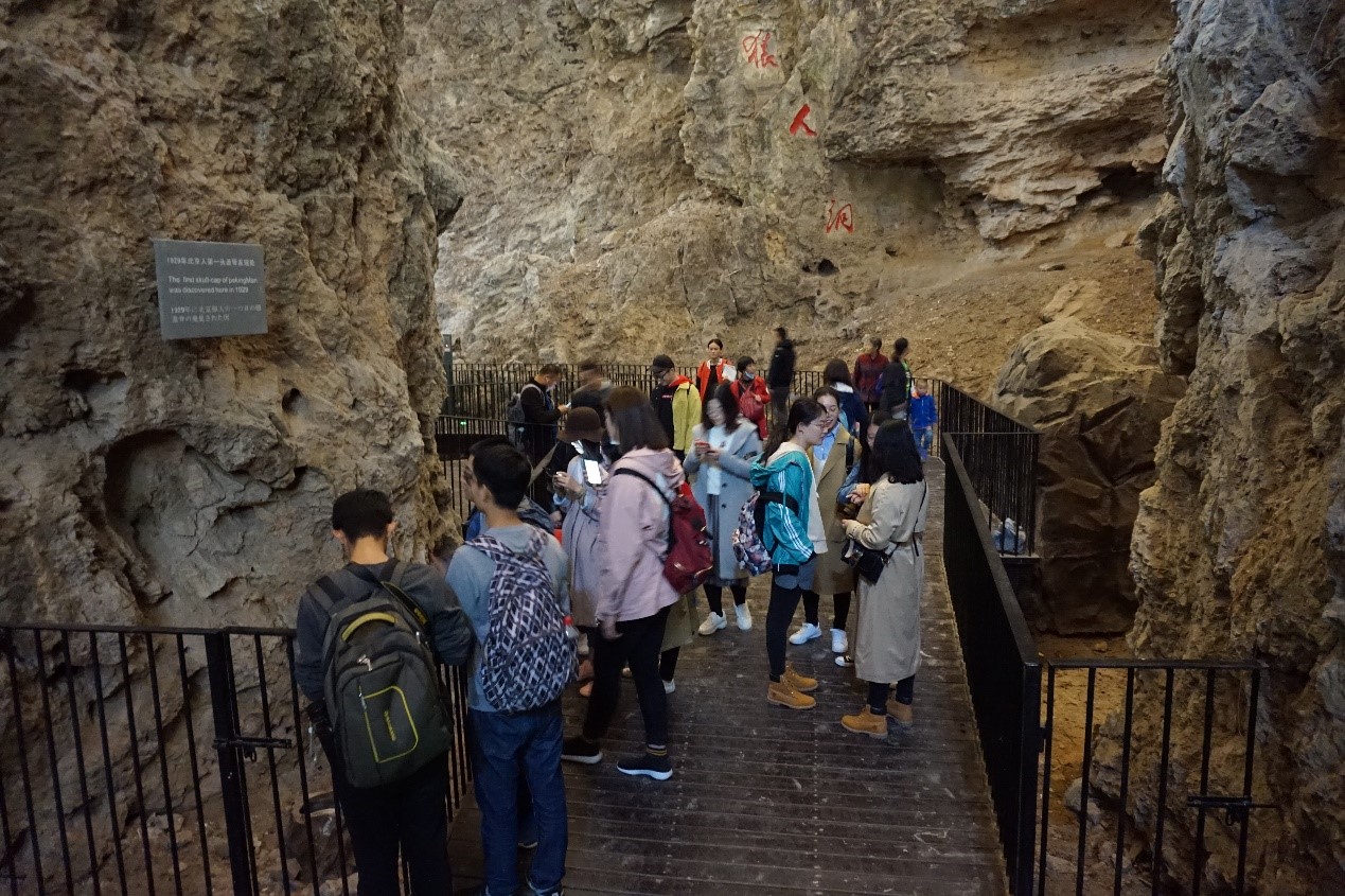 首先参观的是周口店山顶洞遗址,在山顶洞发现了三具完整的人头骨化石以及多件其他解剖部位的化石。实地参观,使同学们切实体会史前人群的生活环境;与课堂知识的结合,也促使人们对史前人群特征、生计方式等方面有了更加深入的了解。