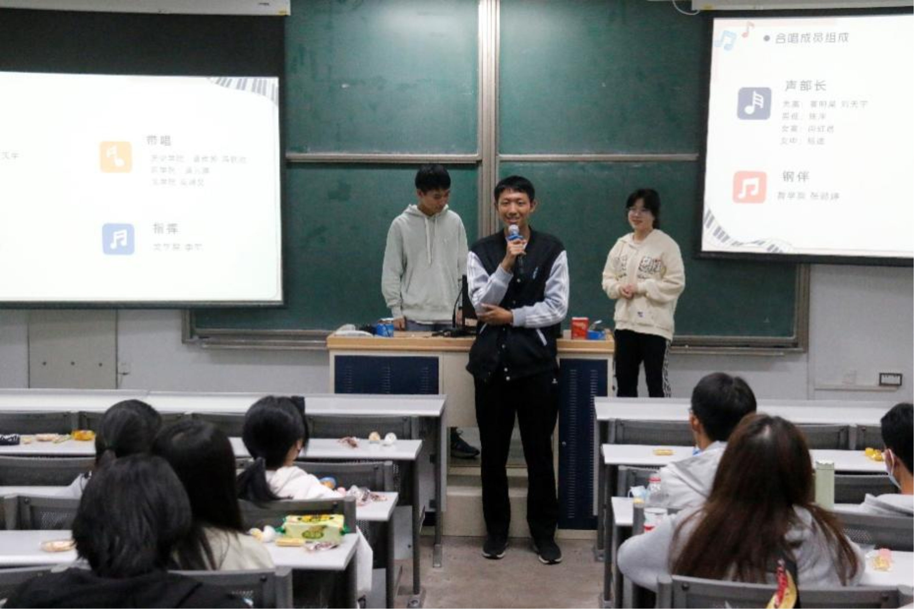 接下来,声部长、带唱师兄、钢伴和指挥一一与成员们见面,表达了对未来两个月训练和比赛的期许,鼓励同学们积极参与训练,期待和同学们留下共同的宝贵记忆。