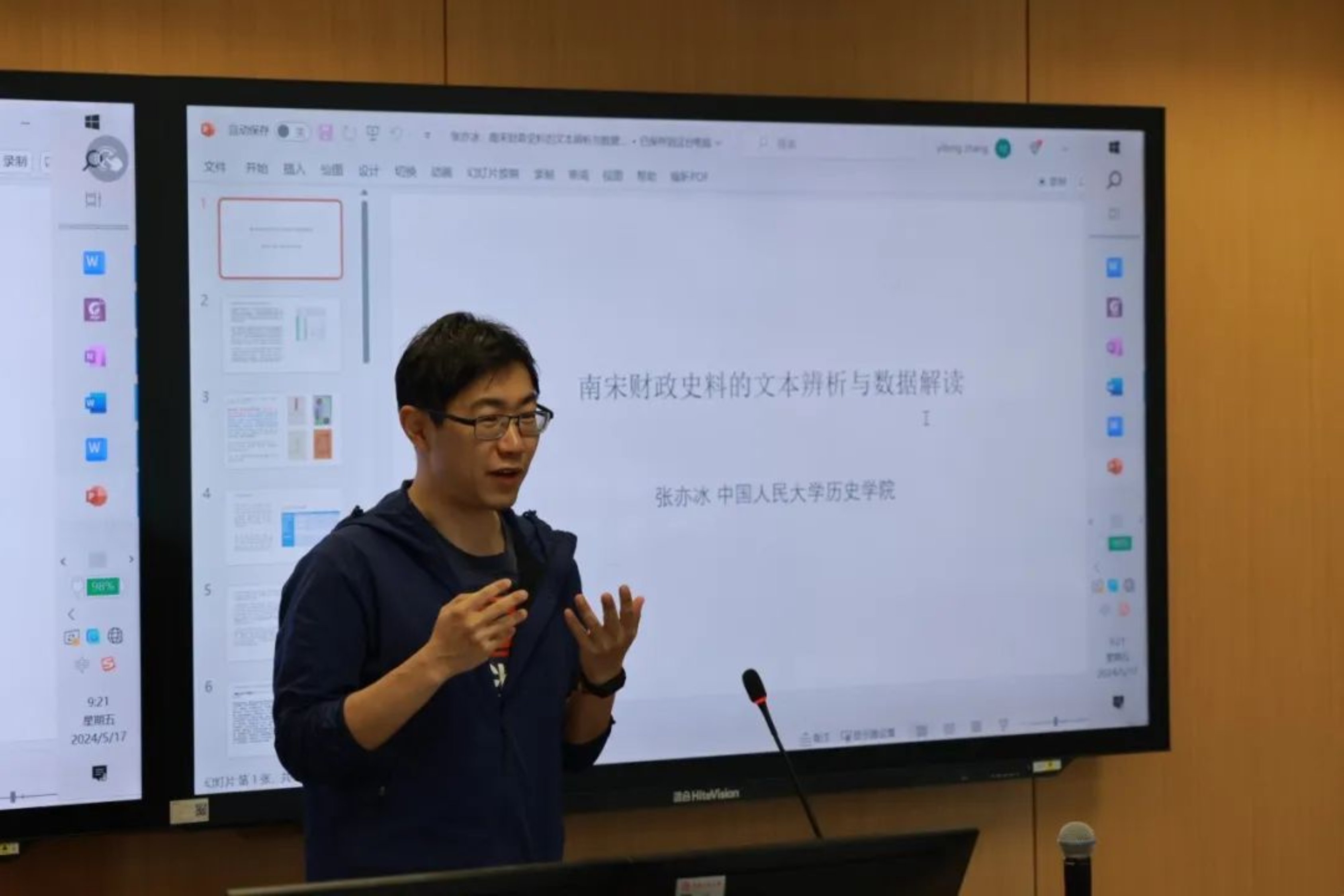 张亦冰老师以《南宋财政史料的文本辨析与数据解读》为题,从文本辨析与数据解读的角度梳理了以《建炎以来朝野杂记》为代表的南宋财政史料。张老师带领同学们对李心传《建炎以来朝野杂记》这一个案中涉及的数据来源、运算逻辑、算法进行分析,进一步强调了合理利用财政数据的重要性。他表示,在进行财政史研究时,不仅要分析材料来源与编纂方式,还要注意辨析作者考证、计算及叙事逻辑,只有准确理解相关数据含义基础才能合理考察南宋财赋制度的运作与演化过程。最后,张老师以熙宁十年商税额为例启发同学思考如何在辨析、理解财政数据的基础上利用数据提供的历史信息,深化议题。