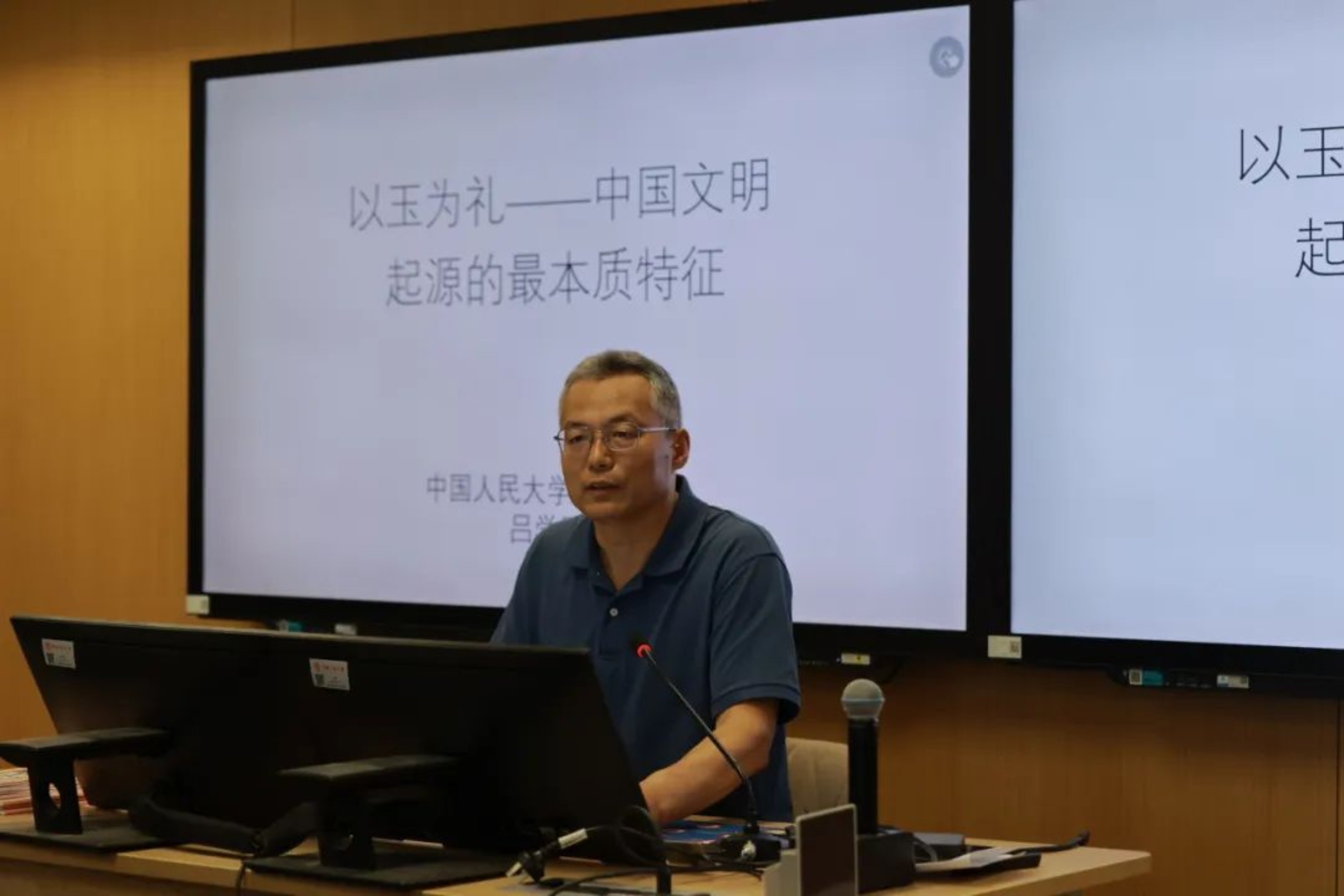吕学明老师以《以玉为礼——中国文明起源的最本质特征》为题,利用丰富的文物图片,以小南山文化、兴隆洼文化、红山文化、大汶口文化、崧泽文化、凌家滩文化、良渚文化为例从时间与空间的双重维度解读了玉礼制的发展过程以及玉器如何成为中华文明的代表。吕老师表示,中国文化将玉器作为美德载体的文化现象在全世界是独一无二的,中华玉文化发展的悠久历史更是我们坚守文化自信的底气。