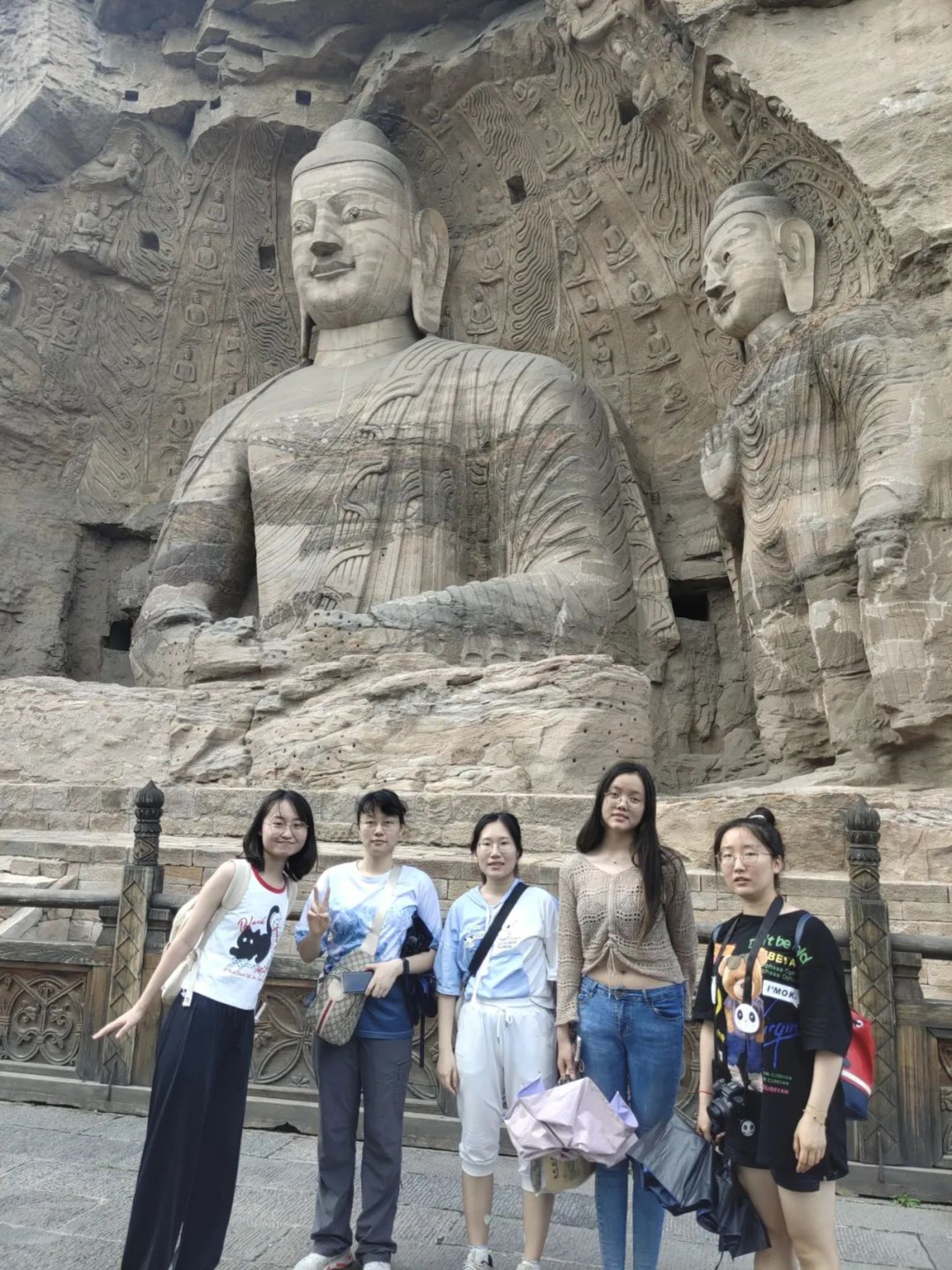 出博物馆后,小组成员前往考察云冈石窟的核心区域,即东部的1-20号窟。最引人注目的当属第20号窟,即著名的“昙曜五窟”之一其主佛高达17米,是云冈石窟最大的雕像。佛像胸以上部位保存较完整,脸型丰满圆润,双耳垂肩,双目有神,面目慈祥,雕饰精美,刚健雄浑,是云冈石窟中最富有代表性的作品。除此之外,小组参观了东部的其他洞窟,并惊叹于云冈石窟中文化的交融。具有典型西方人特征的迦叶造像、兼有中外纹样和建筑风格石窟无一不是中外文化融合激荡的见证者。通过这次考察,小组成员深刻地感受到了云冈石窟的历史价值和艺术价值,也对中国的佛教文化和石窟艺术有了更深的了解和认识。