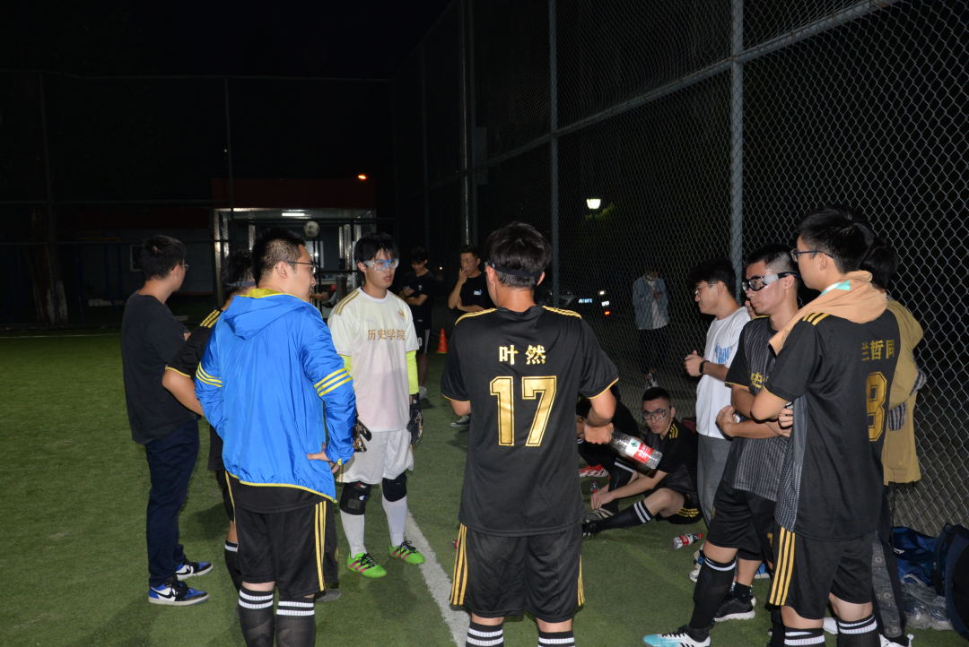 比分持平后,我方队员宋佳鑫和宋思逸每球必争、逢球必抢,门将许兆捷高接抵挡,多次化解对方必进球和死角抽射,终于通过强力的防守和进攻取得了成效。比赛至第八十分钟,我方前场队员打出一系列精妙配合:叶然接中场殷琦传球,将球分给拉边的方南山,后者领球后大力平扫至中间,插上的韦铭语一拨,叶然迎球便打,足球直钻网窝,拿下一分,史院再度领先。