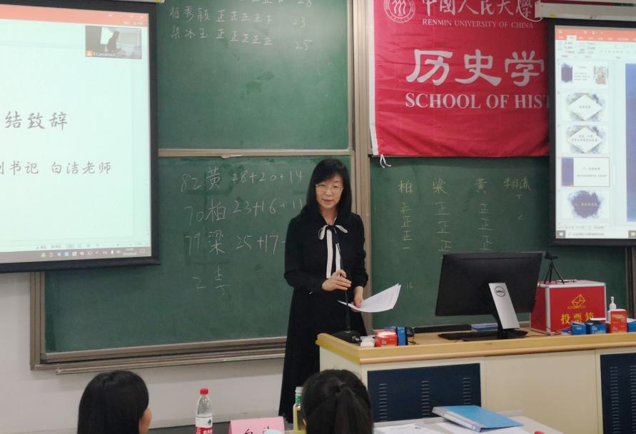 白洁老师做总结致辞。白老师首先回顾了本届研究生会成员的工作经历,对第十六届研会全体同学的付出表示赞许,对竞选者和到场同学表示感谢。接着,她从三方面提出了对新一届研究生会工作的希望与建议: