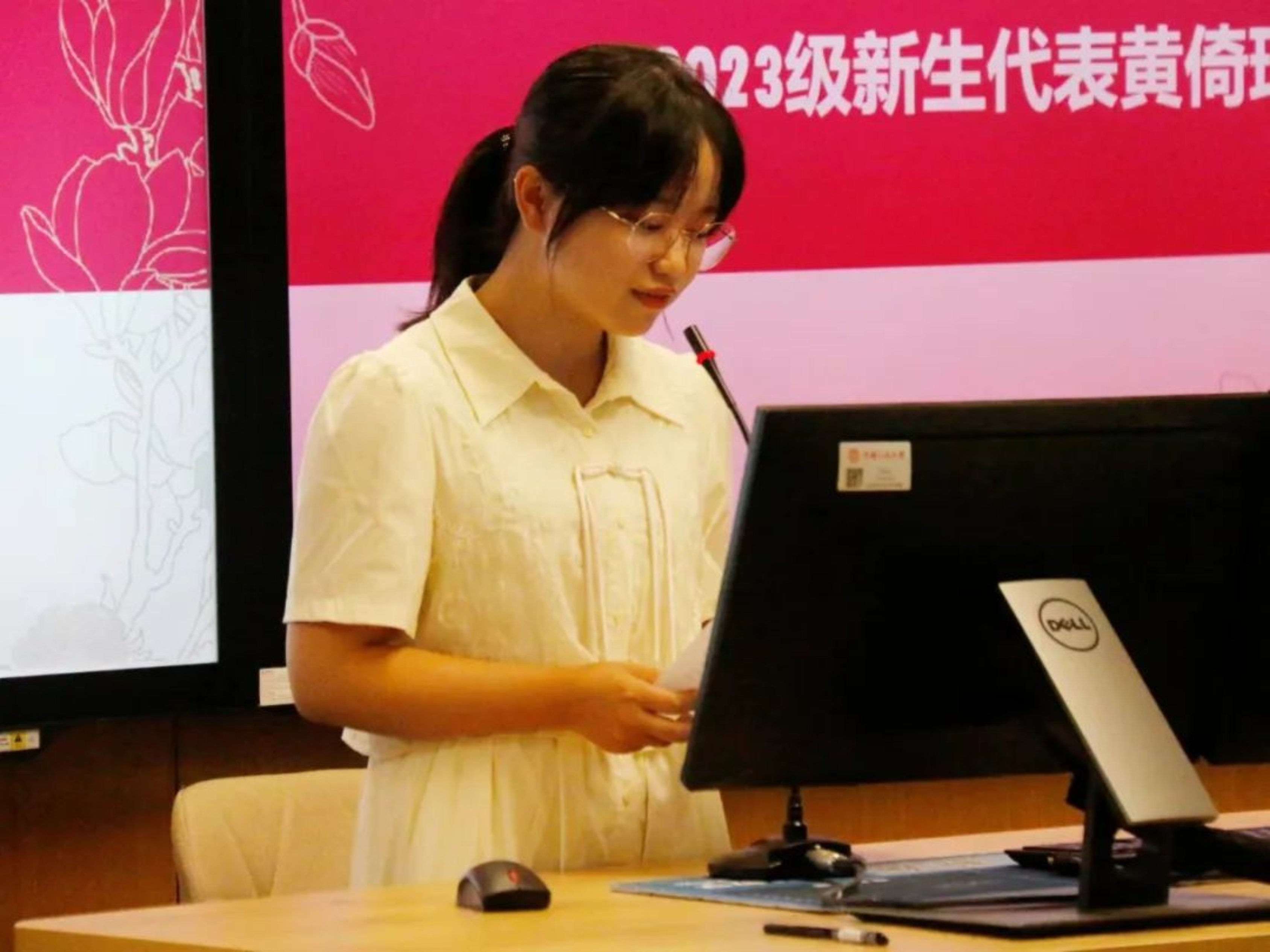 2023级本科新生代表黄倚琦同学作新生发言。黄倚琦同学从自身经历出发,表达了学习历史学的期待。黄同学认为历史学专业学生要注重培养责任担当意识,明确自我发展的目标,在个人与社会的统一中实现人生价值。