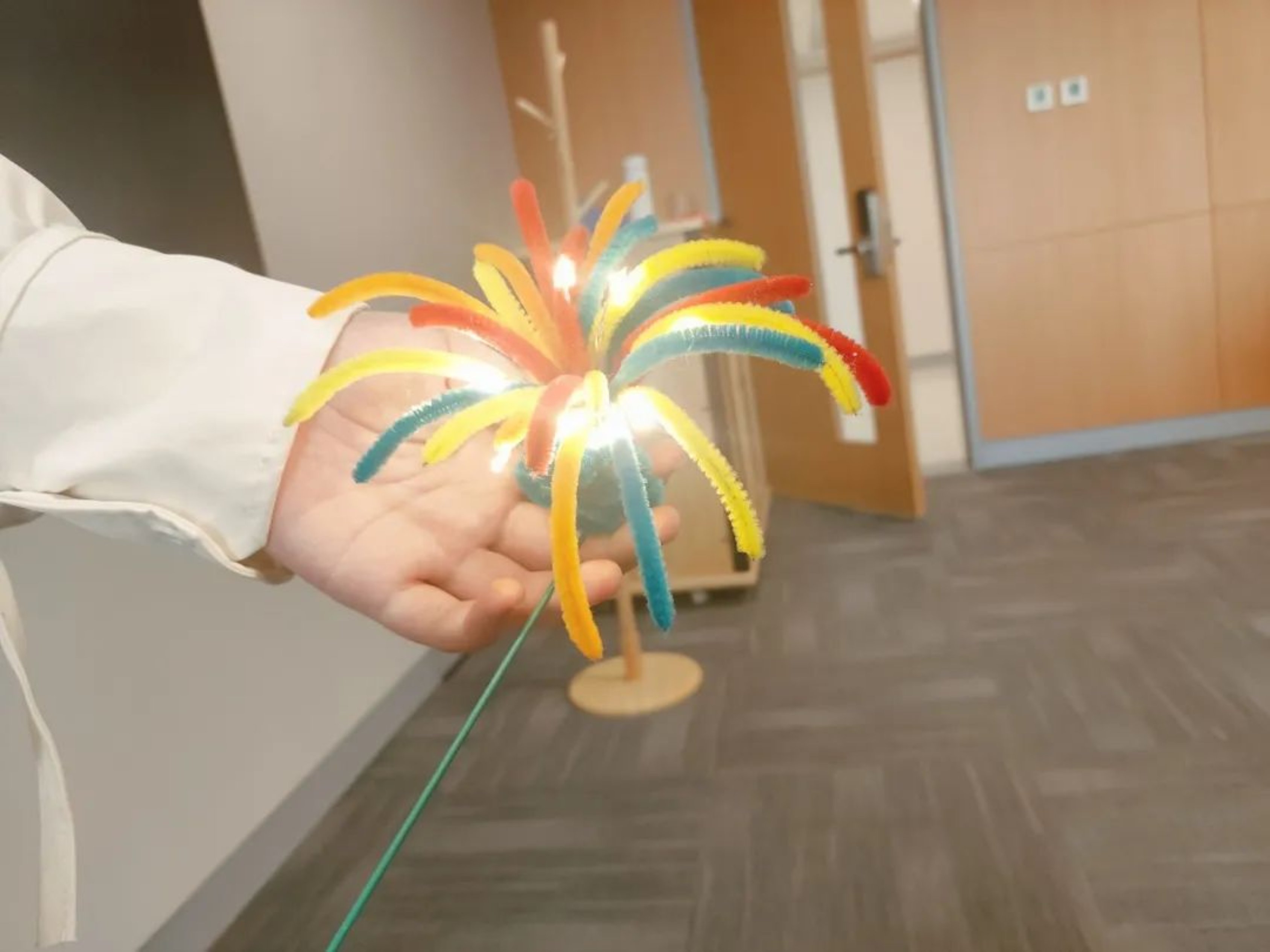 烟花扭扭棒由黄、橙、蓝、红四色扭扭棒组成,将扭扭棒进行细致的修剪后用胶水排列粘合,插上花艺杆,按开小灯,一束美丽的烟花就绽放在手掌中。但与真正的烟火不同的是烟花扭扭棒可以永远绽放,不是昙花一现的绚烂,而是长长久久地夺人眼目。也有很多同学在制作烟花之外创意迸发,用多余的扭扭棒制作了如玫瑰戒指、魔法棒、永生花等众多造型,也同样十分精美可爱。