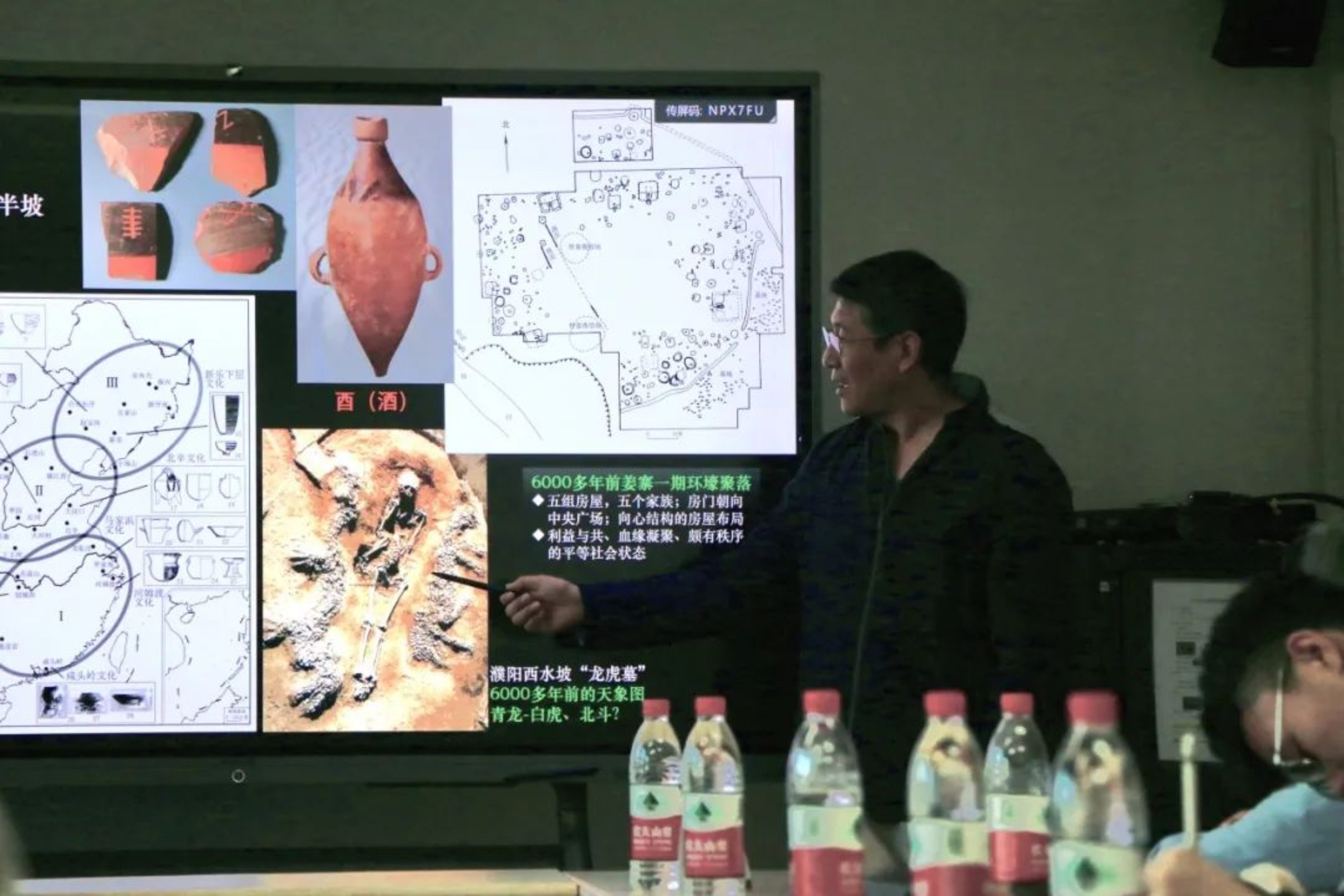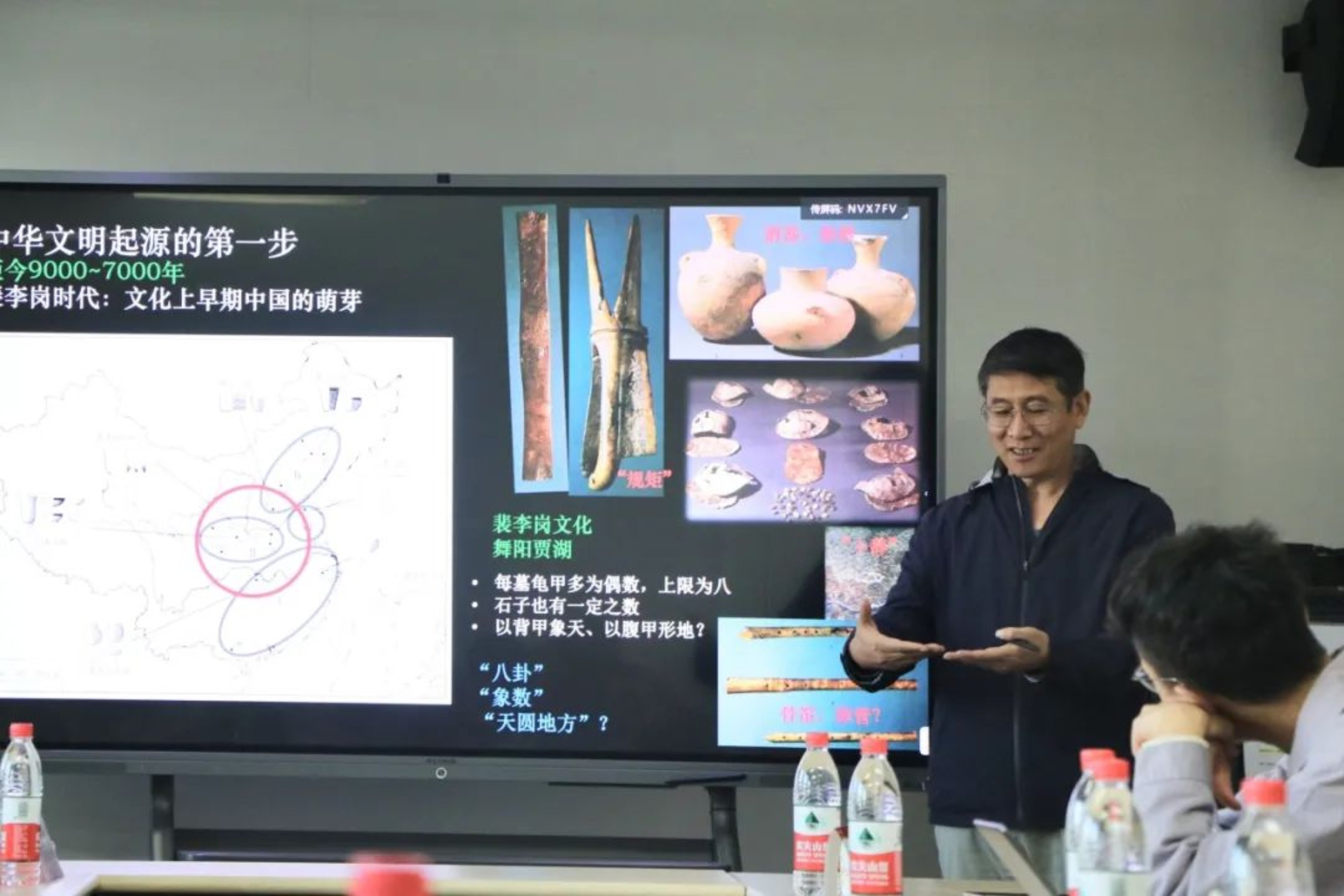 讲座伊始,韩建业老师为学员们明确了 “中国”和“文明”的定义。他认为,文明是指人类物质创造、精神创造和制度创造的综合实体。中国文明起源、形成及早期发展是三个阶段,但不管是哪个阶段,其基础都是农业。韩老师指出,距今8000年左右的裴李岗时代是中华文明起源的第一阶段,这个时候文化上的“早期中国”已经处于萌芽阶段,位于黄河中游地区的裴李岗文化区将黄河、淮河、西辽河、长江中游地区的文化初步联系在了一起,其中贾湖遗址的文化内涵极为丰富,展示了其较为先进的宇宙观、伦理观、历史观。裴李岗以西的白家文化也存在“族葬”习俗,一些精美的陶器上也有彩绘符号。此外,其他地区的文化面貌虽与裴李岗不同,但依旧表现出较为先进和复杂的思想观念、知识系统和社会形态,如钱塘江流域的上山文化、跨湖桥文化、长江中游洞庭湖西南的高庙文化和东北地区的兴隆洼文化等。