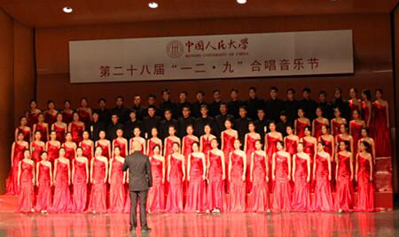 比赛前几天,女生们已经开始带着高跟鞋合排,6日的走台、试衣开始,比赛的气氛逐渐浓厚,大家都在紧锣密鼓地准备着。 7日早上,一吃完早饭,女生们换上华丽的红色裙装,穿上白色高跟鞋,男生们也穿上了笔挺的中山装。粉底、眼影、眼线……化妆有条不紊地进行。由于时间紧,中午联队吃完了订来的盒饭,就立即开始准备上场。一早上紧张的准备,只待下午的精彩绽放。 舞台上播放联队视频时,后台上同学们已经就位,尽管寒冬里大家都只穿着单衣,但都不觉寒冷。“向前!向前!向前!”第一声迸出,掌声雷动。钢伴激昂弹奏,合唱有起有伏,时而激烈、时而渐弱,女声娓娓道来,男声高亢进取,末尾一句“志如钢”将演唱推向了高潮……比赛结束后,马史哲联队在如论讲堂门前合影,“一二九,一起走!”一张合影定格,两个月的排练圆满结束。 “一二•九”结束了,但马史哲联队带给我们的感动和成长并未离我们远去,即便日月变换、沧海桑田,不经意间哼出熟悉的一两句,也会让我们的思绪飞回到那几个月,我们这一个集体,曾经一起欢笑和训练过,曾经一起拼搏和战斗过。我们一起学会了坚持、懂得了担当,收获了友谊,分享了成长。“一二•九”,将成为我们成长道路上重要的一课,也必成为联队中每一位成员人生路上一道难忘的风景。
