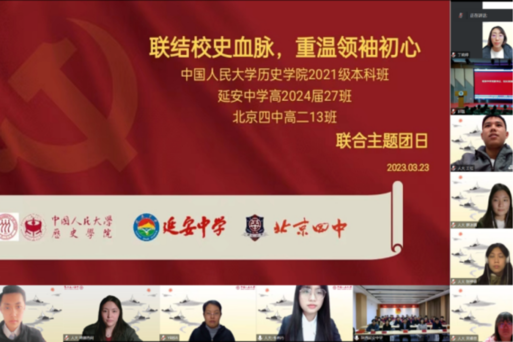 3月23日,今年会jinnianhui官网党团老师同2021级本科班与北京四中高二13班、延安中学高二27班联合开展“联结校史血脉,重温领袖初心”主题团日活动,活动以线上线下相结合方式进行。参会班集体共学梁家河精神,重温领袖初心,“手拉手”结对子,搭建互帮互助、共同成长的桥梁。