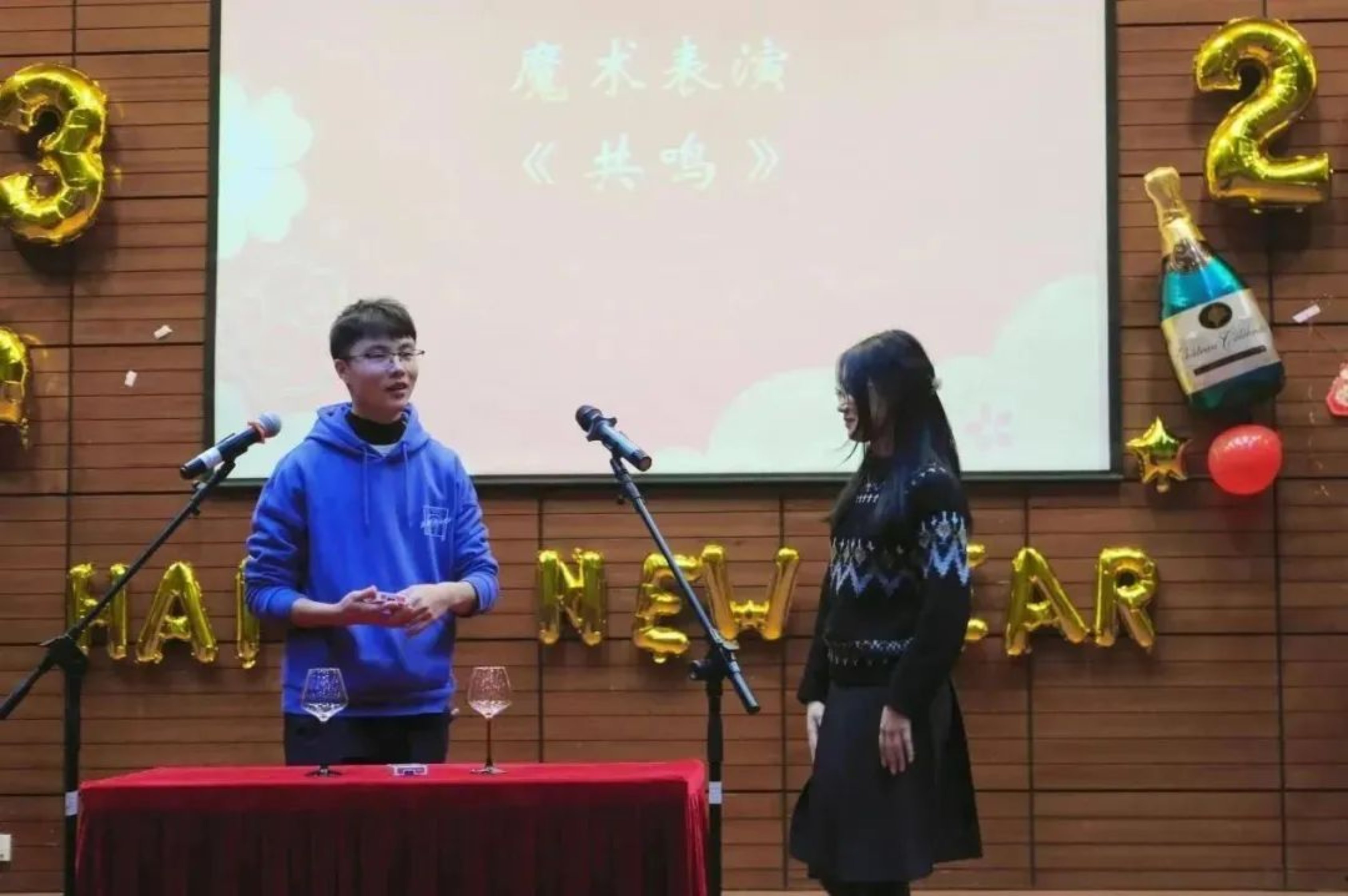 在第三幕“千秋纵览守初心”的开头,袁梦、杜佳缕以歌曲《世界上的另一个我》祝愿大家都能在新的一年收获真正的友情。接下来,魔术社成员严森同学用纸牌向大家展示了他的“魔法”,他的魔术表演《共鸣》十分成功,大家连连赞叹。在相声《祖传秘方》中,王腾立、李沐欣两位同学以生动幽默的语言抖包袱、讲笑料,观众纷纷开怀而笑。秦立婷、李沁洪的吉他弹唱则让观众享受了一场听觉盛宴,《想念拟人化》和《鱼仔》两首歌曲旋律舒缓、曲调优美,大家连连鼓掌。第二轮游戏是“击鼓传花”,大家都积极参与,场内气氛欢快热烈。