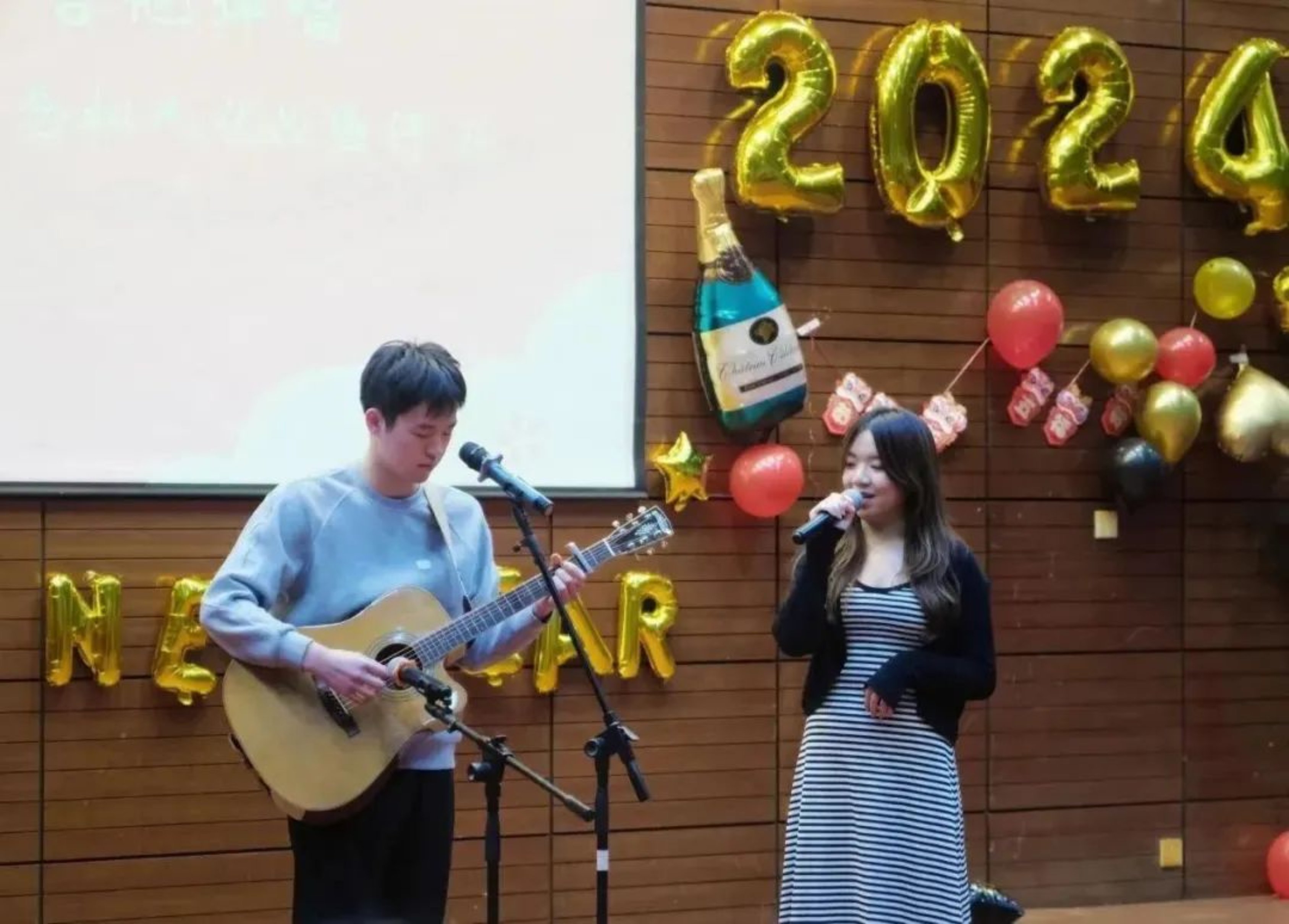 第二幕是“不负韶华历千帆”,华夫饼人声乐团的歌曲《Can’t Help Fall in Love》展现出他们娴熟的演唱技术,歌声中流露出的充沛情感使观众如痴如醉。接下来是小品《时间都去哪了》,陈家佑、杨钦麟、于尚波、许兆捷、刘治忠五位同学的表演诙谐有趣,大家在捧腹大笑中反思过度使用电子产品导致的时间浪费问题。刘一霖同学演唱的《甜蜜蜜》既为联欢会增添了甜蜜的气氛,又为新的一年翻开了充满幸福喜悦的第一页。随后是欢乐的“抢椅子”游戏环节,会场内欢声笑语不断。