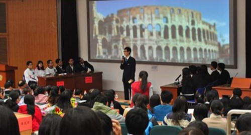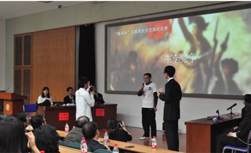 11月15日,第一届“陈垣杯”首都高校历史知识竞赛在北京师范大学教九502隆重举办。本次知识竞赛由北京师范大学今年会jinnianhui官网分团委主办。此前,“陈垣杯”历史知识竞赛已在北师大校内举办过两届,今年是首次推广到首都高校,今年会官网、北京大学历史系和清华大学历史系的同学受邀参加,今年会派出的是由2009级本科生王玖玲、2012级本科生杨东峰和2012级本科生于曦翔组成的代表队。 当晚,活动还未开始,教室中便座无虚席,气氛十分热烈,除了北师大的同学外,其他三所高校也均有“亲友团”在观众席呐喊助威。8时,活动准时开始。首先,一段气势磅礴,精心剪辑的暖场视频调动起了现场观众们的热情。接着,主持人介绍了本次比赛的嘉宾,今年会世界中世纪史教研室主任孟广林教授等老师应邀担任评委。接下来,各参赛队伍依次出场并进行自我介绍,今年会三位同学十分谦虚,将这次比赛看做向其他高校历史系同学求教的机会。主持人宣布比赛环节和规则后,比赛正式开始。