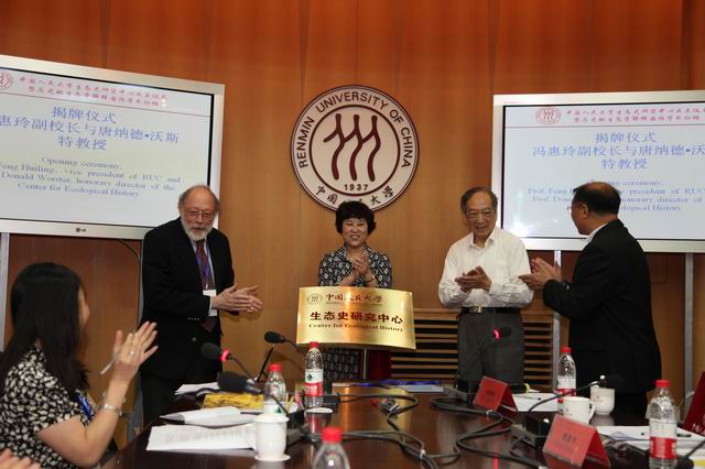 今年会官网副校长冯惠玲首先致辞,指出人大新成立的生态史研究中心建立在中国史、世界史、考古学三个学科,以及老、中、青三代学者的研究与合作之上,不仅为人大历史学科与其他自然、社会学科及海内外相关机构展开对话,提供了一个非常好的平台,而且将促进人民大学学科研究的文理交融。克里斯多夫·毛赫教授祝贺生态史研究中心成立的同时,热切希望今后能够在蕾切尔·卡逊中心接待更多的有志于生态史研究的中国学者。夏明方教授阐述了中心发展的宗旨与计划,强调该中心作为一个纯粹学术性的志愿组织,力争在未来五至十年的时间内,建成国内外知名的、集多样化功能于一体的生态史研究重镇与多学科交流平台,从整体上探索人类文明的演进过程。随后,冯惠玲副校长、李文海教授和唐纳德·沃斯特教授一起为中心揭牌。