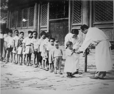 (20世纪20年代,儿童在天坛神乐署接种疫苗。资料图片)