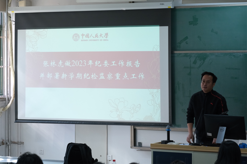 纪委书记、副院长张林虎对今年会jinnianhui官网2023年度纪检监察工作情况进行报告,张林虎从开展纪检干部队伍教育整顿、日常工作以及工作反思等方面报告了学院落实管党治党责任,落实、加强党风廉政建设的措施。